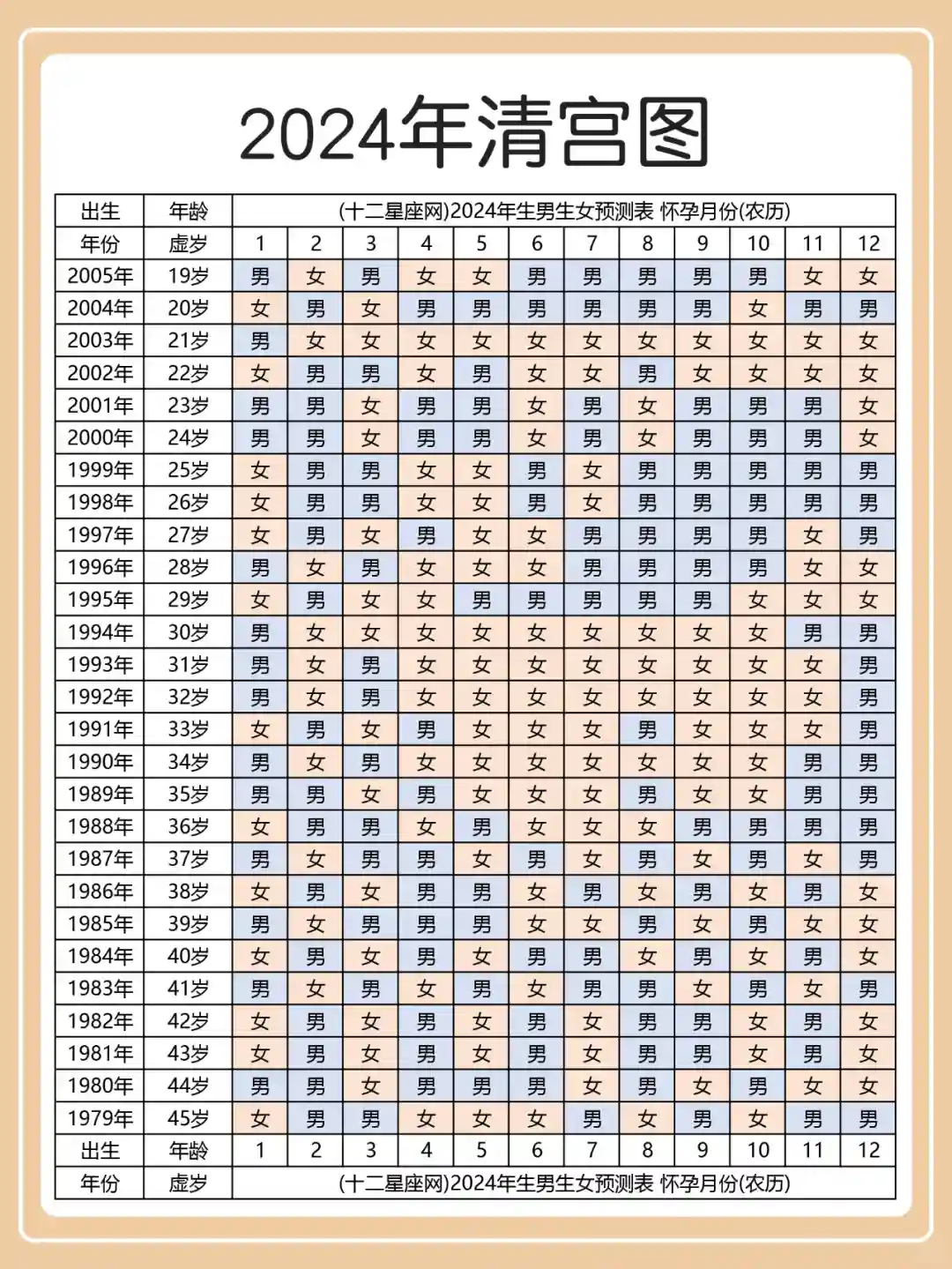 而怀孕月份指的是农历受孕之月(末次姨妈时间)。只要知道自己的具体出生年份和受孕月份,看的时候横纵坐标对其一起看就能看出来你想要的结果了。