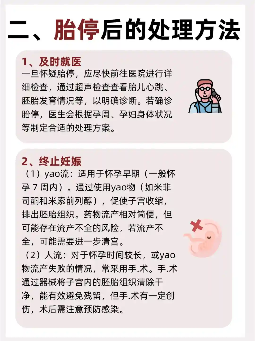 1、及时就医:一旦怀疑胎停,应尽快前往医.院进行详细检查,通过超声检查查看胎儿心跳、胚胎发育情况等,以明确诊断。若确诊胎停,医.生会根据孕周、孕妇身体状况等制定合适的处理方案。