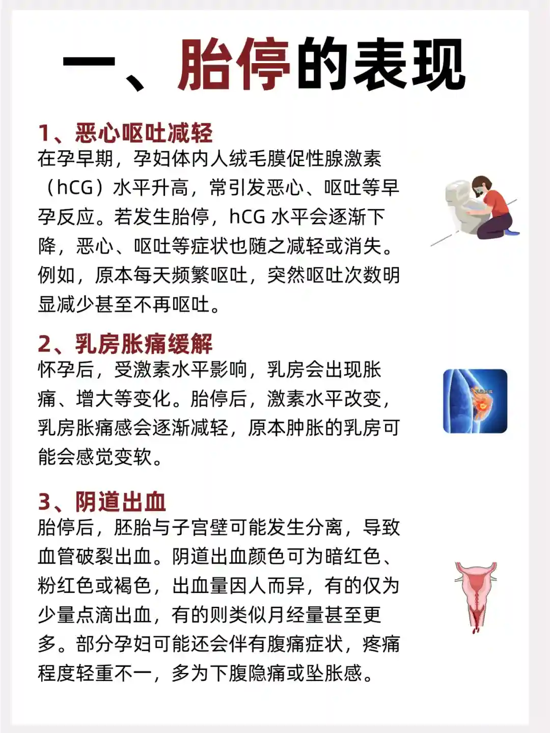 1、恶心呕吐减轻:在孕早期,孕妇体内(hCG)水平升高,常引发恶心、呕吐等早孕反应。若发生胎停,hCG 水平会逐渐下降,恶心、呕吐等症状也随之减轻或消失。例如,原本每天频繁呕吐,突然呕吐次数明显减少甚至不再呕吐。