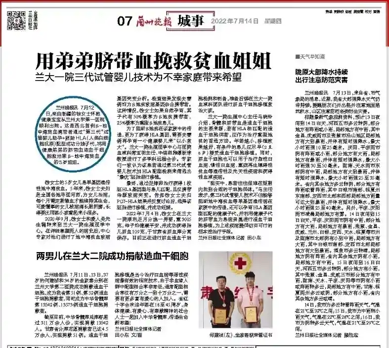 这是西北首例β-地中海贫血携带者通过“第三代”试管婴儿助孕+胚胎HLA(人类白细胞抗原)配型成功分娩子代,将用健康弟弟的脐带血造血干细胞救治患β-地中海贫血的5岁姐姐。