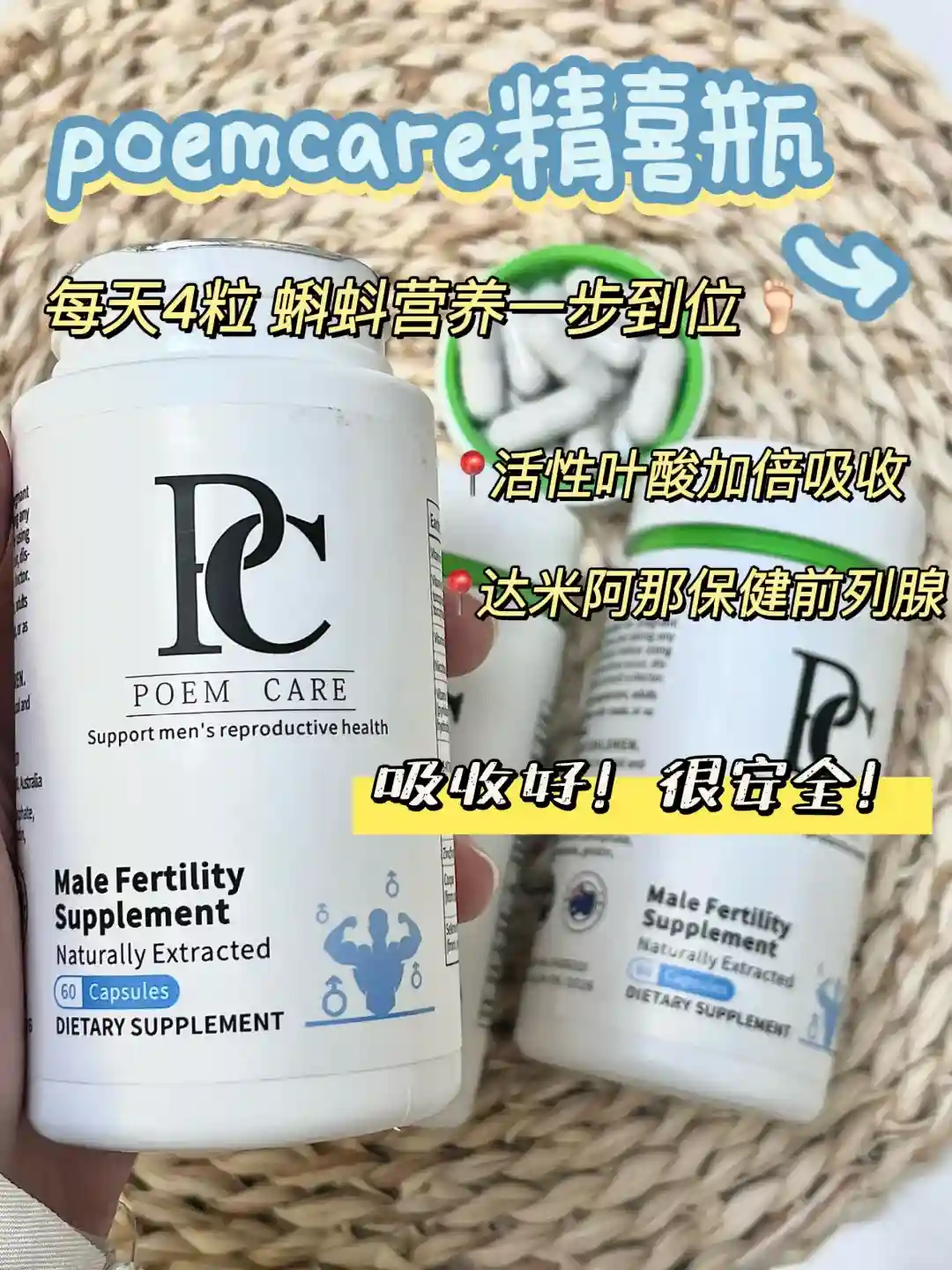 回家就开始查资料,看到了活性叶酸和达米阿那,好像在备孕圈挺火的,都说提活力效果不错。纠结了下给老公买了poemcare精喜瓶,更好吸收更有针对性一些,搜了下发现确实挺火的哈,很多反馈都不错!