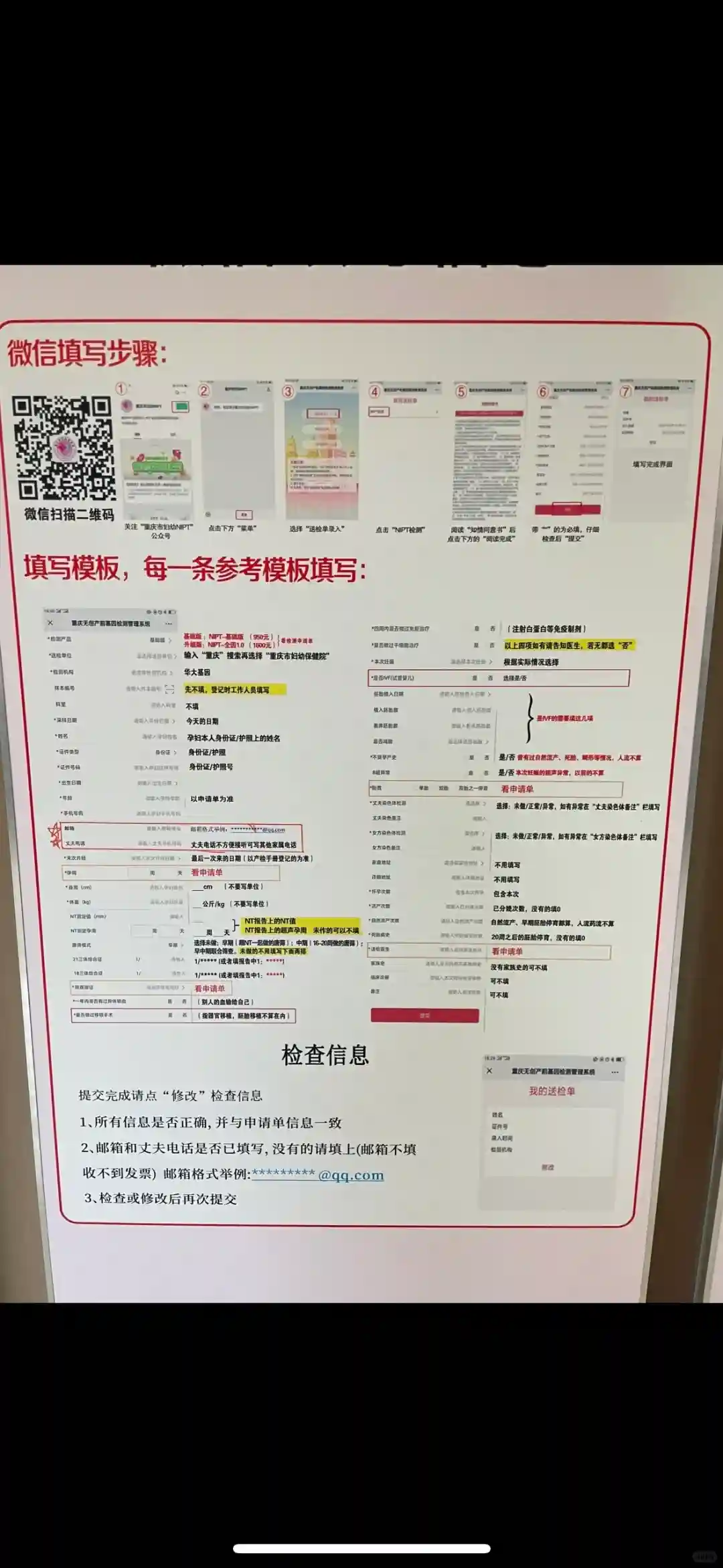 我是在成都建档,目前16周➕,听说成都市妇幼无创基础版本比较贵,当然我没去问过,只是在小红书上看,说重庆市妇幼冉家坝院区做无创基础版本只要950.由于回了趟老家离重庆比较近,就去重庆做无创了,那天不巧碰到周末,都没放号,等到放号的时候只有周末下午的了,去了挂的杨亚君的号,由于我没在那儿建档,要求我必须做一次彩超,花了189,后面看了单子后才给我开的无创!好像是在四楼,必须填个表,就是图片中的这些!填好拿进去有人给你一个抽血的管子,付款!下去抽血!整个过程就2.3个小时!注意做彩超人爆多,可能是周末的原因吧,抽血还好!抽完血15个工作日拿结果,公众号上可以查的到报告!