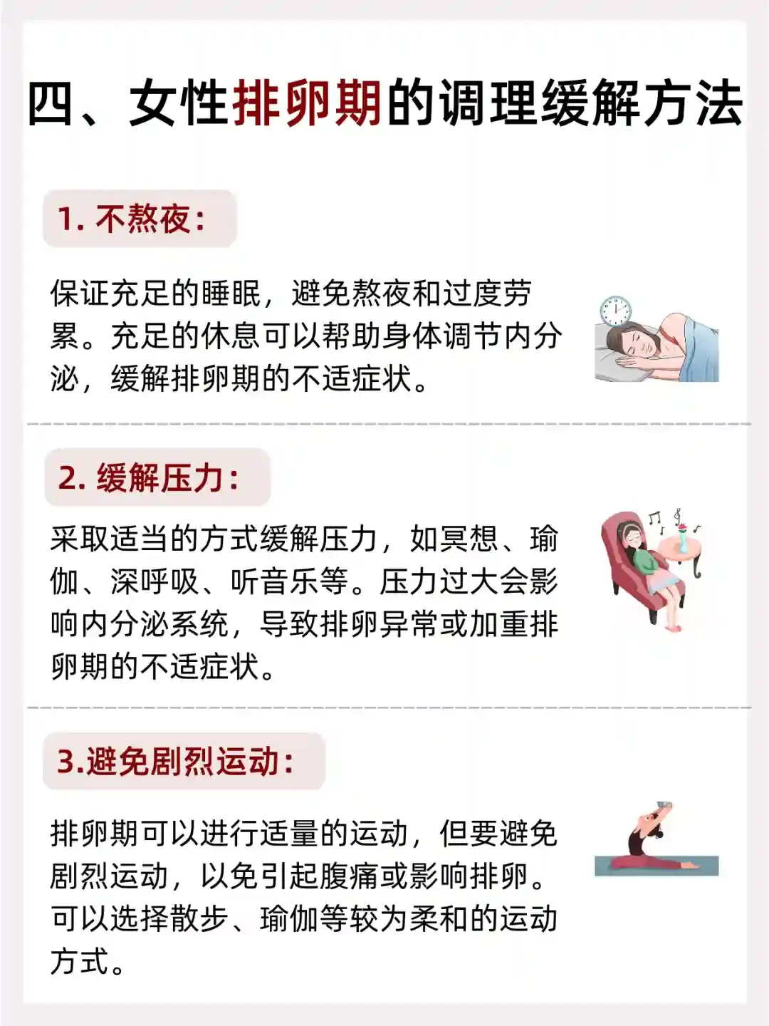 保证充足的睡眠,避免熬夜和过度劳累。充足的休息可以帮助身体调.节.内.分.泌,缓解排卵期的不适症状。