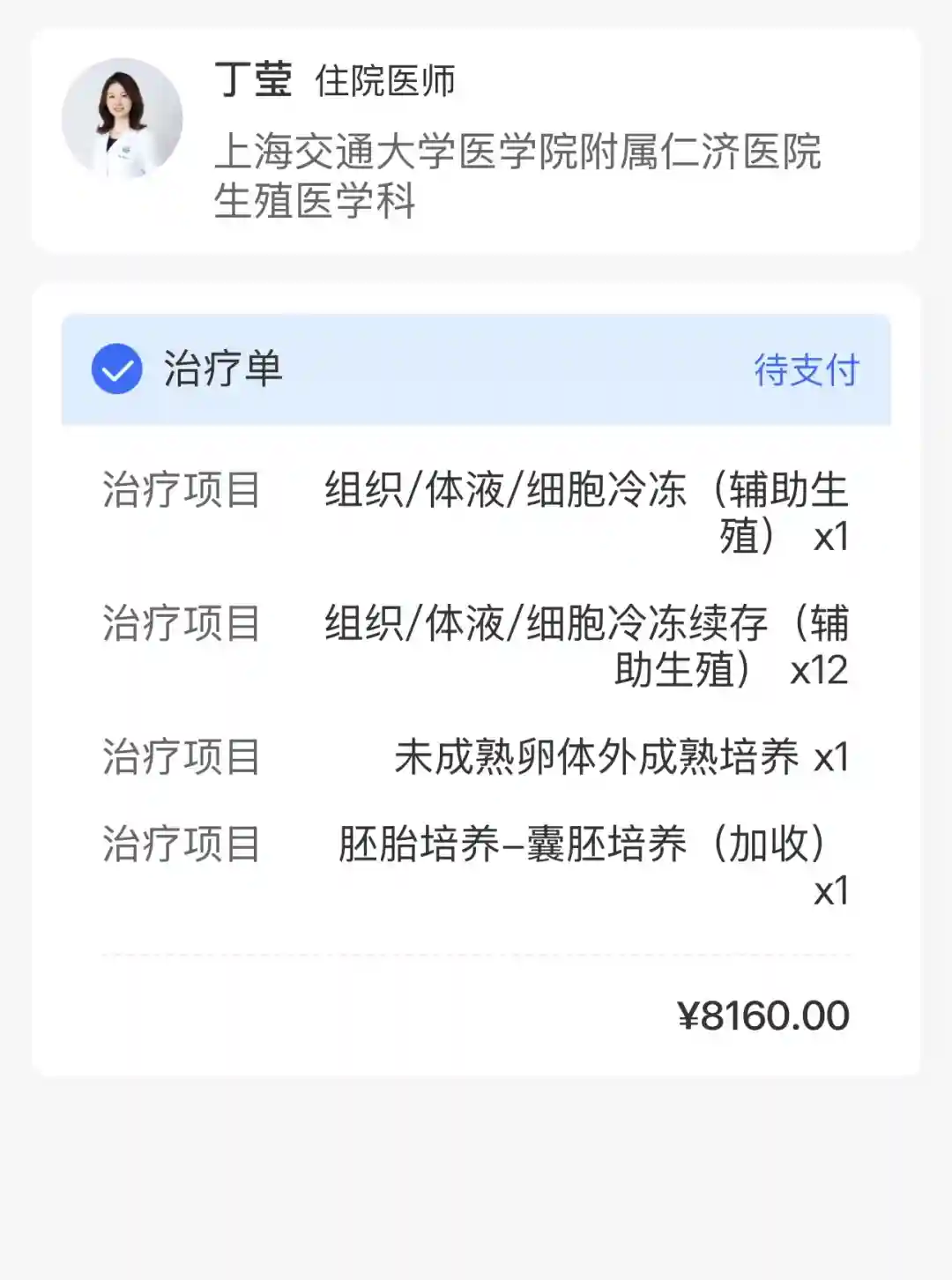 ✏️从治疗单来看,费用包括组织/体液/细胞冷冻、续存、未成熟卵体外成熟培养以及胚胎培养等项目,总计💰8160元。