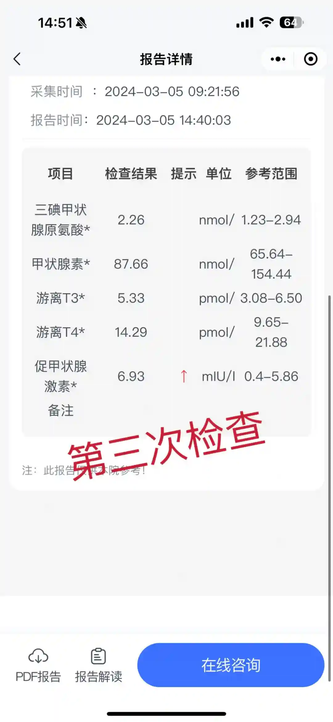 终于熬到宝宝一周,去妇幼抽血复查,宝宝生出来就低体重,看到针头插到宝宝细细的血管里面也是奔溃医生让先回家,检查结果出来会电话通知我,等结果这几个小时心里真是七上八下不停祈祷没事的。但是最后结果出来(图二),医生告知促甲状腺激素比足底血筛查升高,甲状腺素也降低了,按结果显示是甲减,需要用药看着这么小的宝宝要吃药,真是太遭罪了。正巧,月子中心的医生又来查房我给她看了检查结果,她说可以再等一两个星期再去复查,宝宝刚出生受母体影响偏多,等他大一点自身甲状腺完善一点再去看看,最佳的治疗时期是三个月内。于是,我们也打算去医科大挂个专家号,换家医院看看,如果最终还是要吃药也听听其他医生的指导。