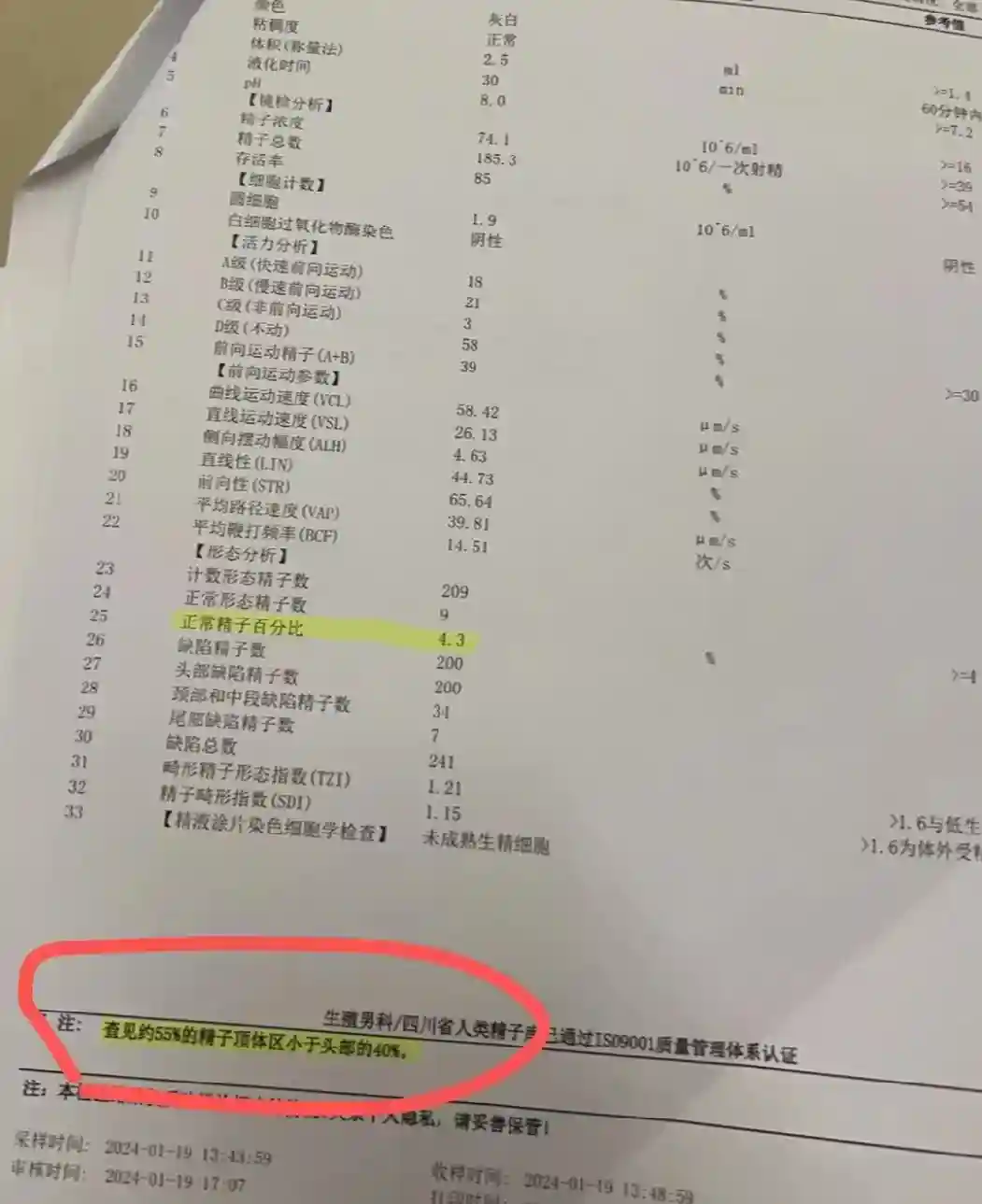 24年1月19日,复查正常形态率4.3%,碎片率9.4%,A+B 39%(华西30合格,西囡42合格),停药