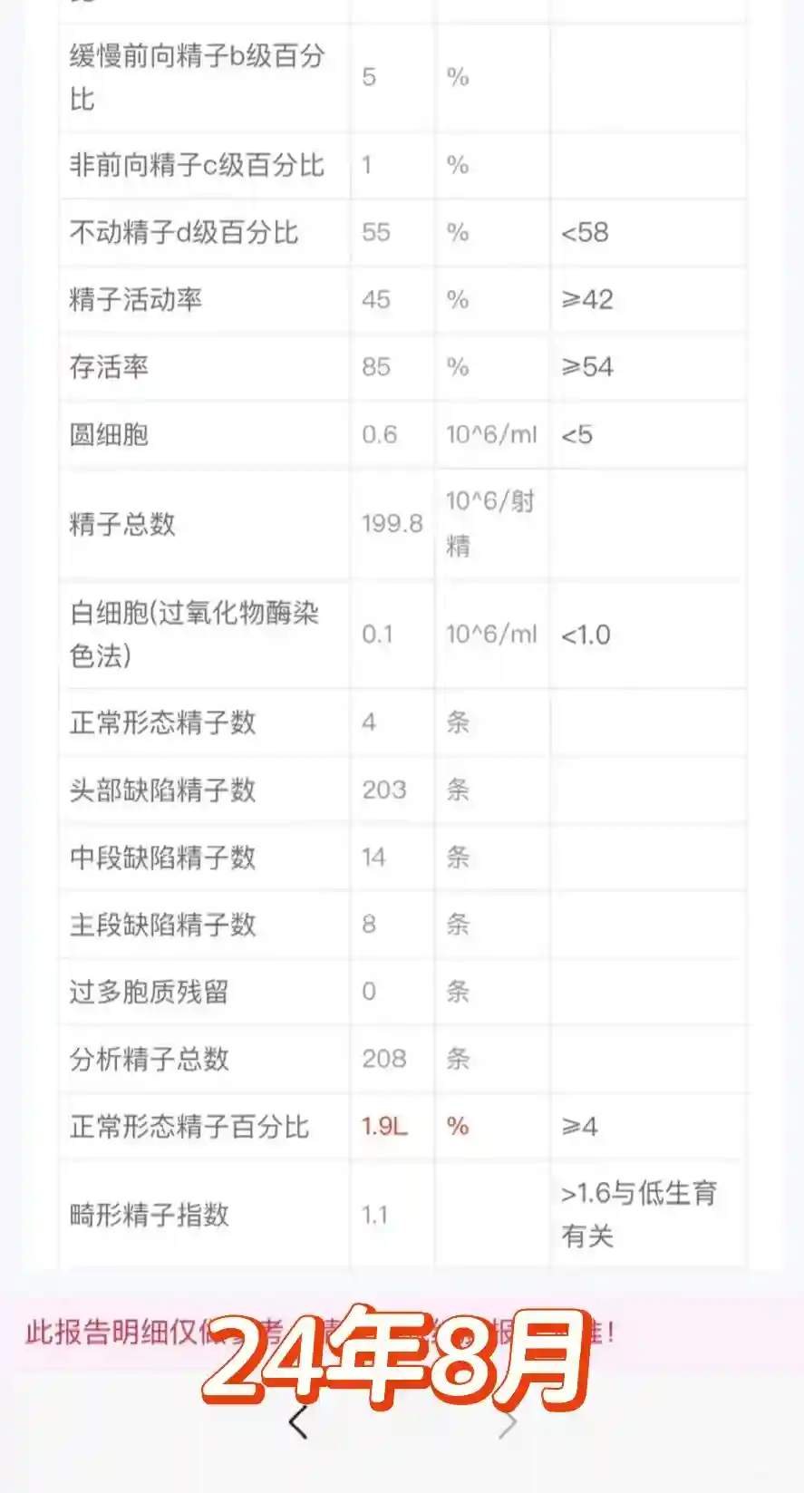 24年8月西囡进周检查精子,正常形态率1.9%,做过b超,显示没有精索静脉曲张,碎片率5.3%(15以下,越低越好),A+B 45%