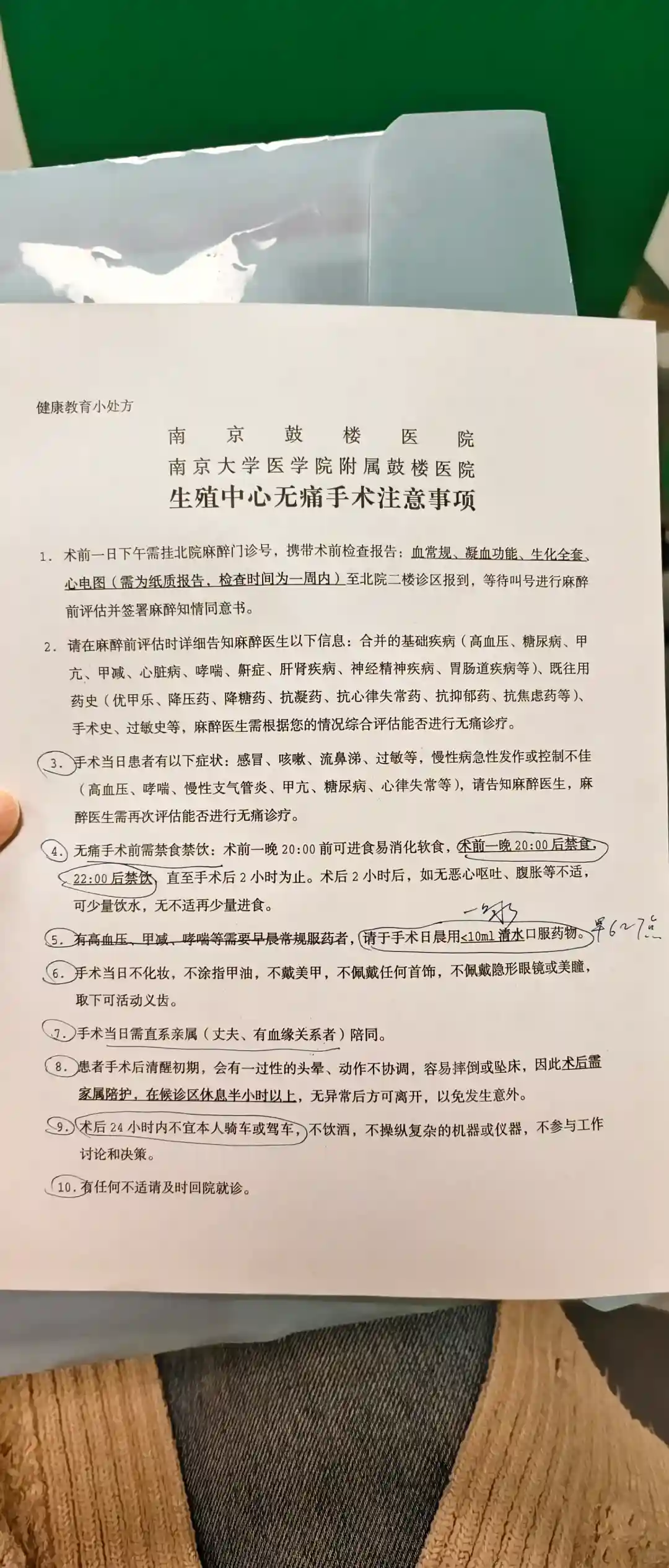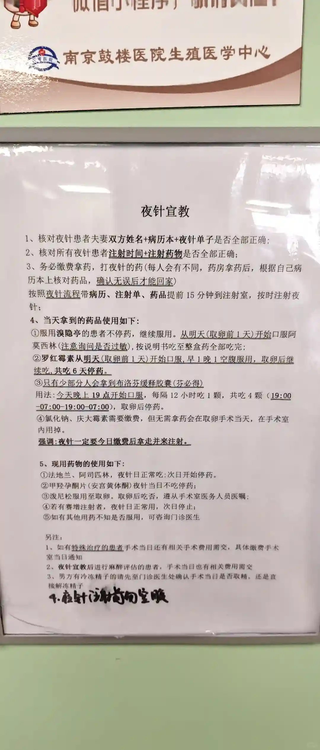 鼓楼这边是先抽血才能刷b超号,b超做完医生把病历本收走,让看小程序消息,有消息后可以去缴费拿药。然后去b超前台拿病历本,医生会把用药再跟你讲一遍防止弄错,最后去刷号打针。第一天直接给我开了三支大果,每天300单位打四天,第五天返院抽血b超。开启麻醉评估,下午去做了心电图,早上空腹抽血。然后挂北院的麻醉门诊把单子给医生看促排期间的流程都差不多,促排第10天做完抽血超就收到短信通知夜针,把病历本放到超前台让中午12:30来听注意事项 了解后就能去缴费拿药了晚上按照夜针时间提前到医院就行