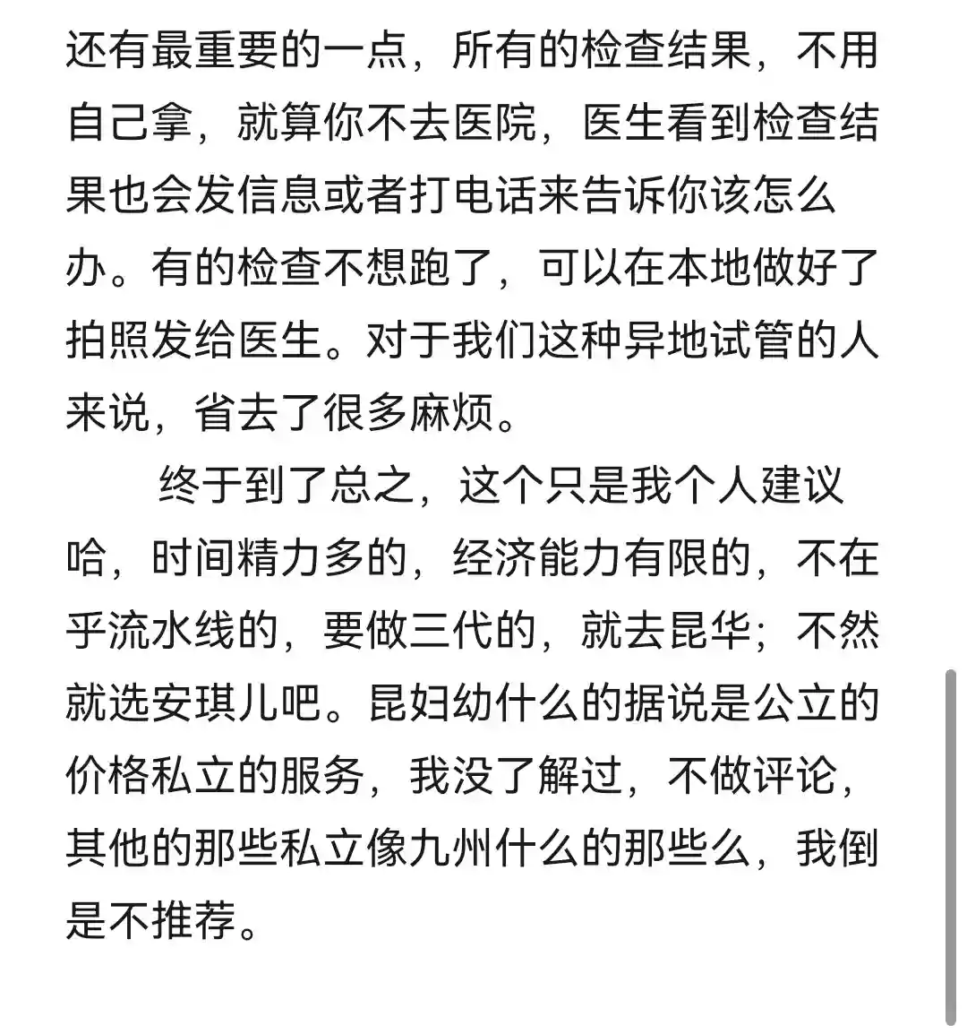 做试管跑医院的情况也会比较多,特别是还要上班的姐妹,要考虑自己方不方便。我是在小县城,距离近的么就是曲靖妇幼,我之前也去看过病,感觉一般,其次就是人不熟,还有技术这个问题,我始终相信省级医院的技术一定强过市级。试管分三代,比如全云南省,只有云南省第一人民医院可以做三代。当然也有很多人在曲靖妇幼一次成功了的,主要看自己的选择。加上有亲戚就在云南省第一人民医院上班,有个照应,我就去了,但是做完所有的检查,我就放弃公立医院了。经济不紧张的情况下,真的,选私立吧,很香。我后来是去了安琪儿,主要做以下对比哈: