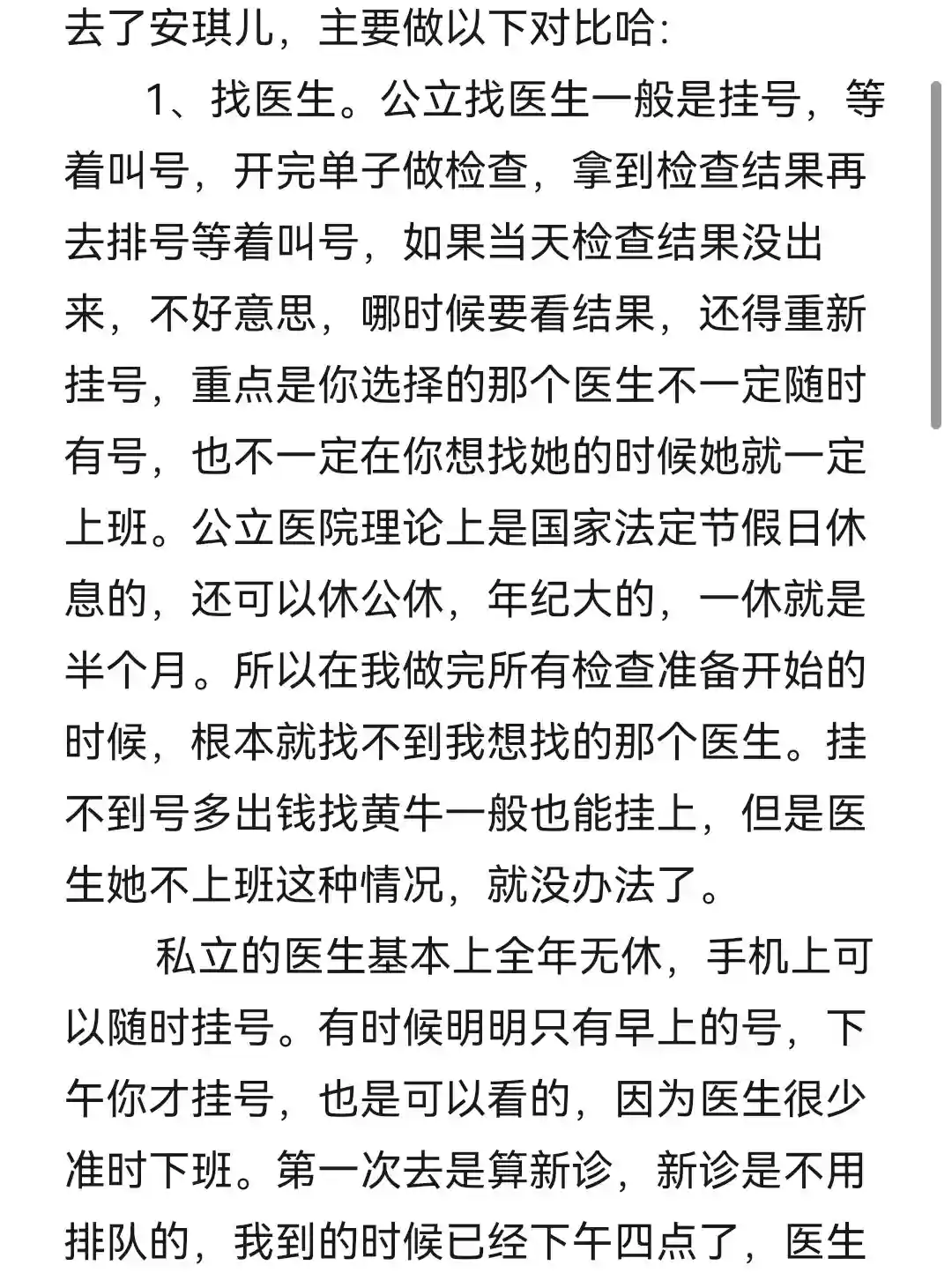 1、找医生。公立找医生一般是挂号,等着叫号,开完单子做检查,拿到检查结果再去排号等着叫号,如果当天检查结果没出来,不好意思,哪时候要看结果,还得重新挂号,重点是你选择的那个医生不一定随时有号,也不一定在你想找她的时候她就一定上班。公立医院理论上是国家法定节假日休息的,还可以休公休,年纪大的,一休就是半个月。所以在我做完所有检查准备开始的时候,根本就找不到我想找的那个医生。挂不到号多出钱找黄牛一般也能挂上,但是医生她不上班这种情况,就没办法了。