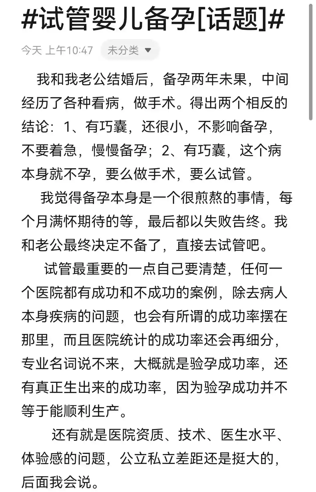 试管最重要的一点自己要清楚,任何一个医院都有成功和不成功的案例,除去病人本身疾病的问题,也会有所谓的成功率摆在那里,而且医院统计的成功率还会再细分,专业名词说不来,大概就是验孕成功率,还有真正生出来的成功率,因为验孕成功并不等于能顺利生产。