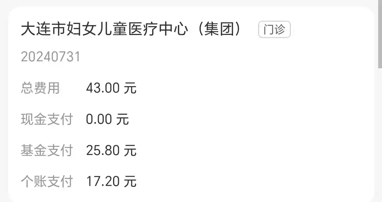 第一天的费用女方:挂号12+B超检查43(统筹25.8+个人账户支付17.2)
