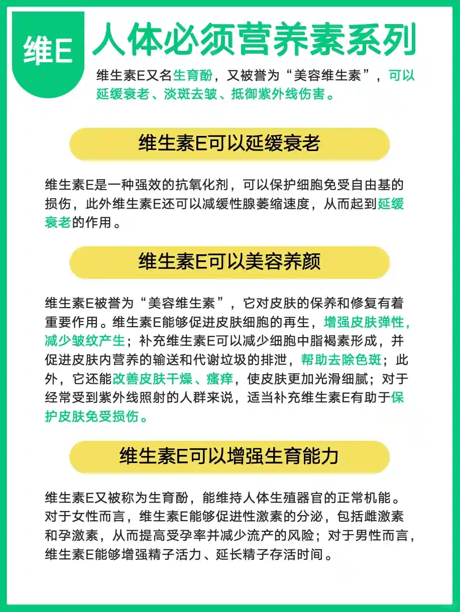 维生素E是一种强效的抗氧化剂,可以保护细胞免受自由基的损伤,此外维生素E还可以减缓性腺萎缩速度,从而起到延缓衰老的作用。