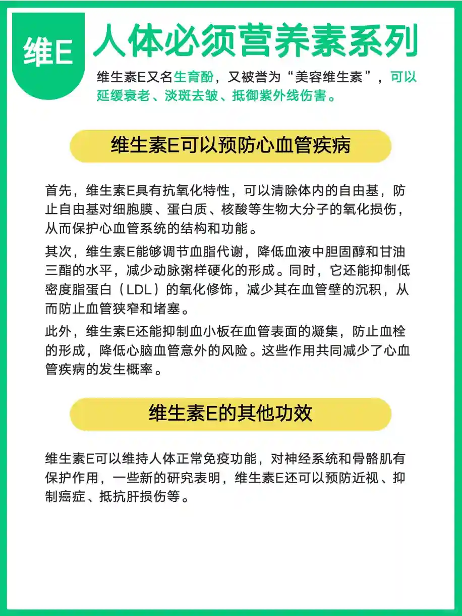 维生素E可以预防心血管疾病、维持人体正常免疫功能,对神经系统和骨骼肌有保护作用,一些新的研究表明,维生素E还可以预防近视、抑制癌症、抵抗抗肝损伤等。