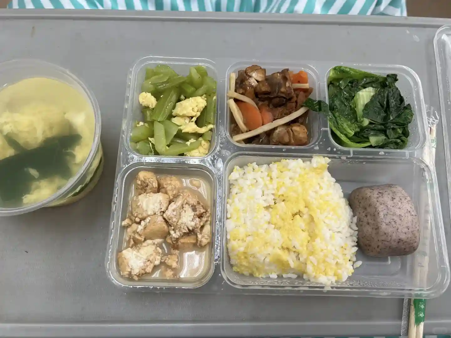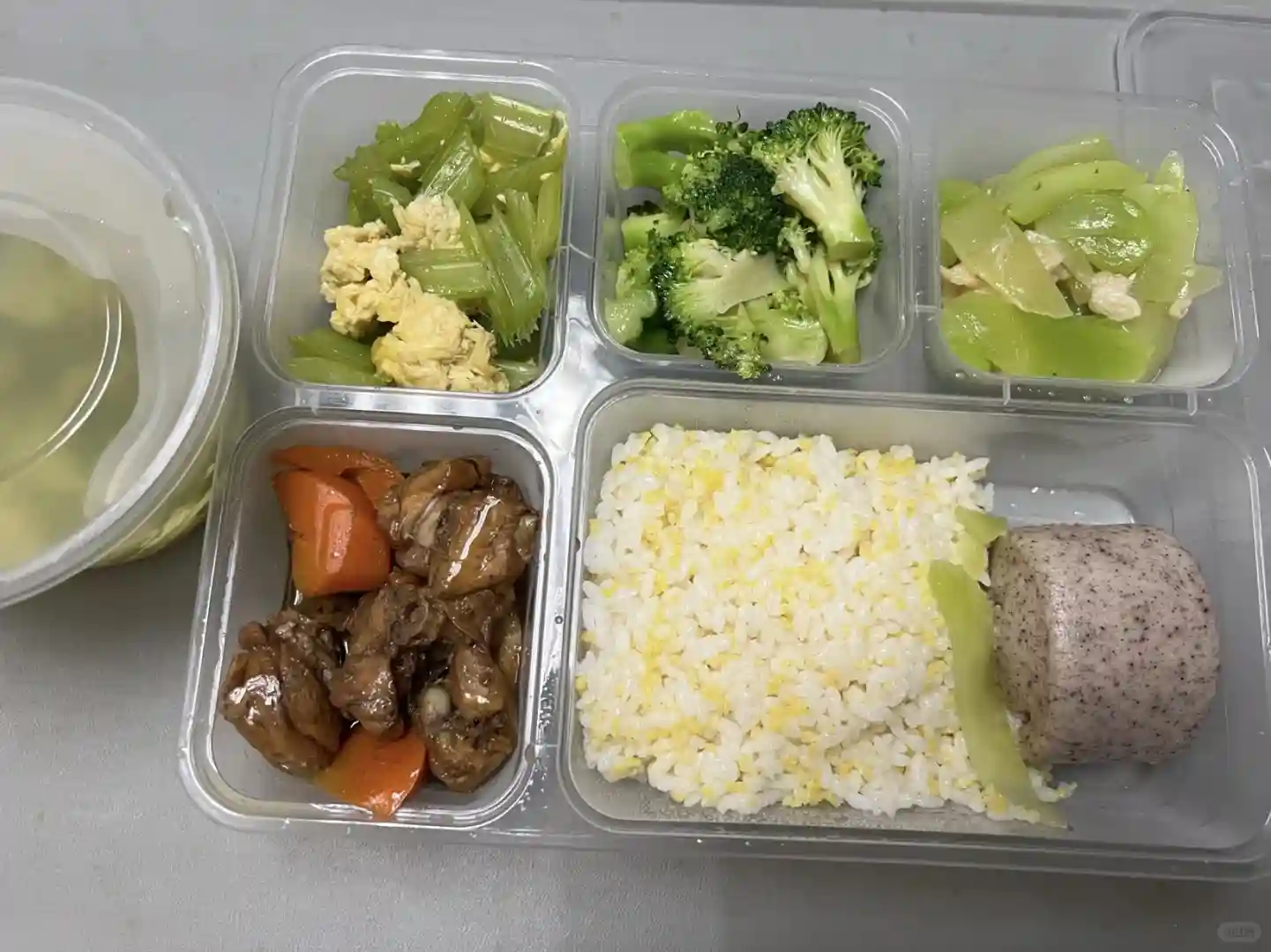 11:00午餐先喝汤再把青菜吃完,芹菜太难吃了没吃,豆腐吃了两口,鸡肉吃完米饭吃完,馒头还是没吃