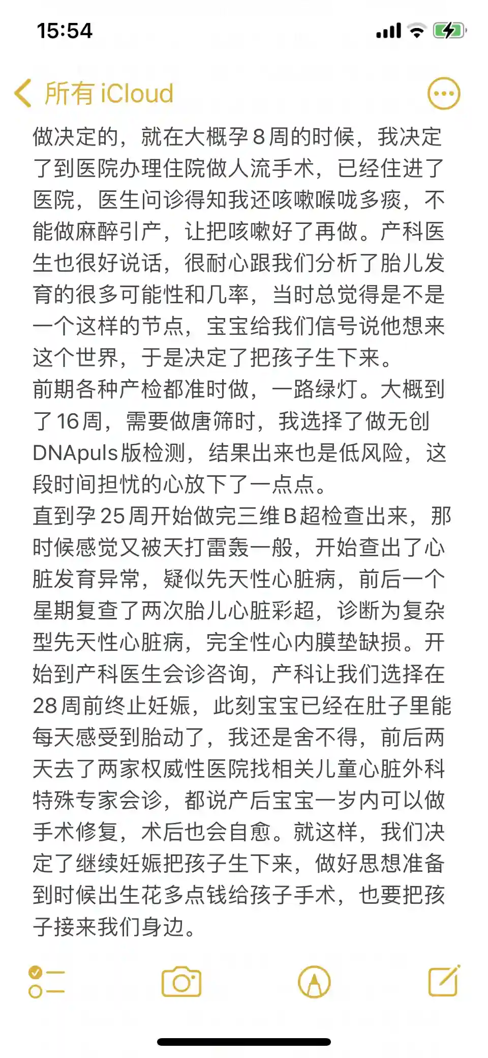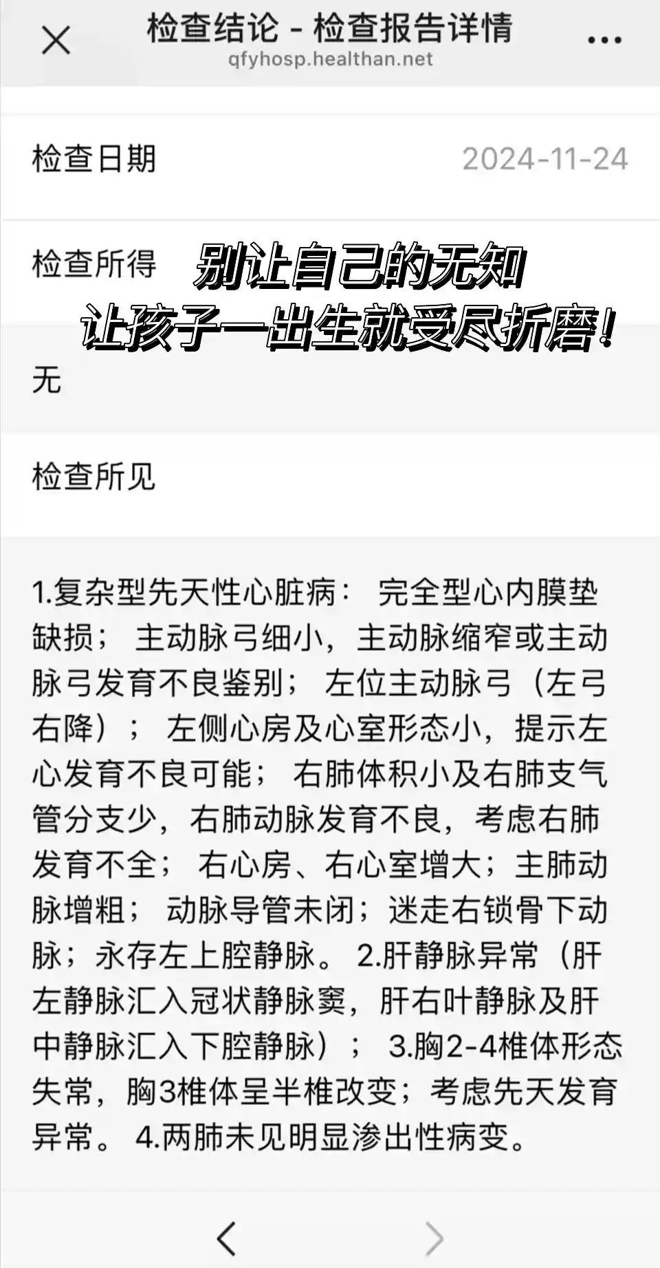 直到孕25周开始做完三维B超检查出来,那时候感觉又被天打雷轰一般,开始查出了心脏发育异常,疑似#先天性心脏病,前后一个星期复查了两次胎儿心脏彩超,诊断为复杂型先天性心脏病,完全性心内膜垫缺损。开始到产科医生会诊咨询,产科让我们选择在28周前终止妊娠,此刻宝宝已经在肚子里能每天感受到胎动了,我还是舍不得,前后两天去了两家权威性医院找相关儿童心脏外科特殊专家会诊,都说产后宝宝一岁内可以做手术修复,术后也会自愈。就这样,我们决定了继续妊娠把孩子生下来,做好思想准备到时候出生花多点钱给孩子手术,也要把孩子接来我们身边。