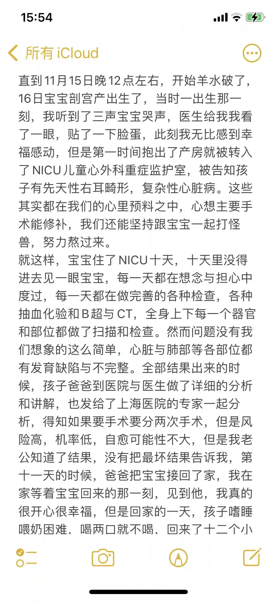 直到11月15日晚12点左右,开始羊水破了,16日宝宝剖宫产出生了,当时一出生那一刻,我听到了三声宝宝哭声,医生给我我看了一眼,贴了一下脸蛋,此刻我无比感到幸福感动,但是第一时间抱出了产房就被转入了NICU儿童心外科重症监护室,被告知孩子有先天性右耳畸形,复杂性心脏病。这些其实都在我们的心里预料之中,心想主要手术能修补,我们还能坚持跟宝宝一起打怪兽,努力熬过来。