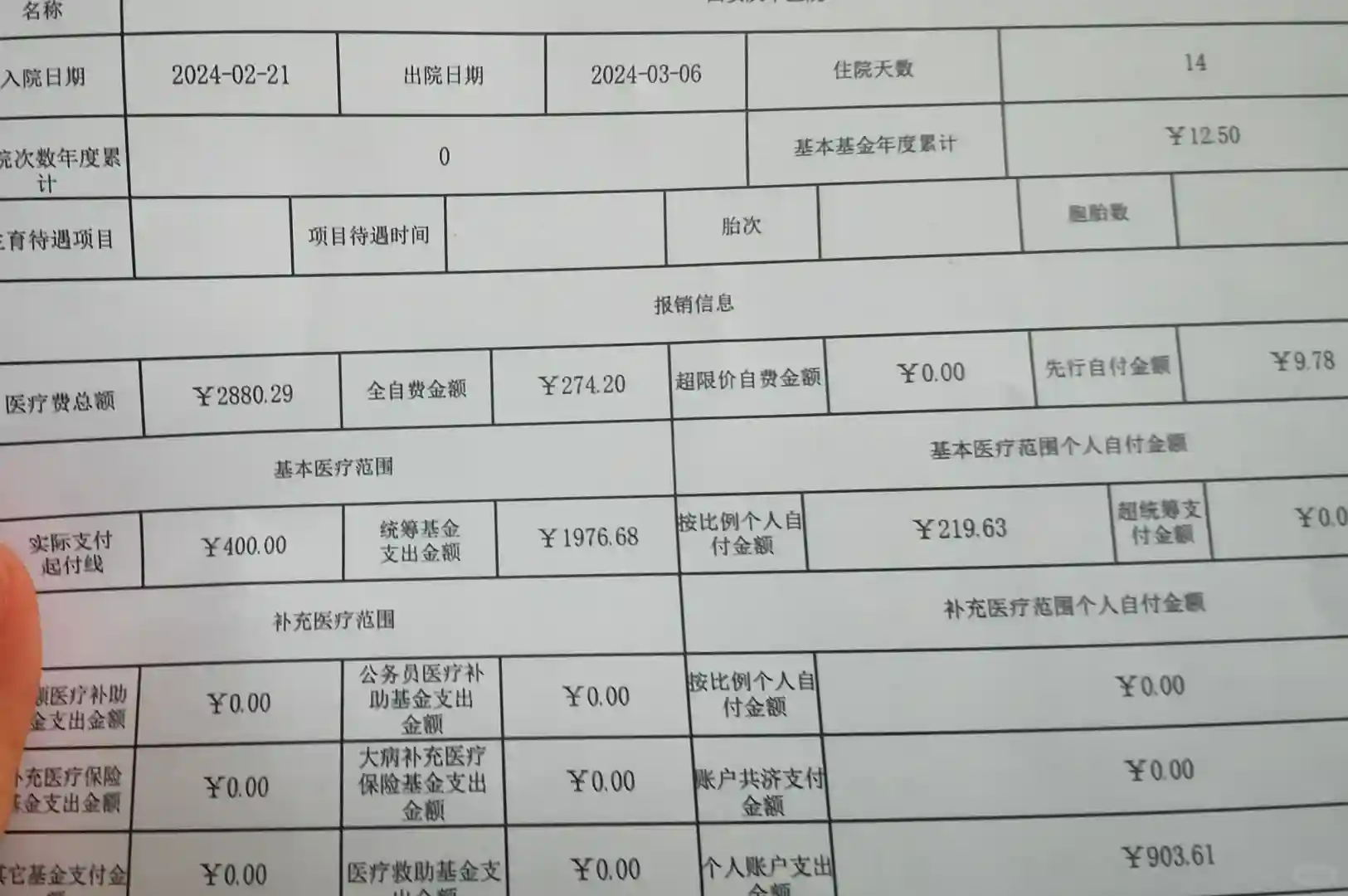 住院总花费:2880(还怪吉利的哈哈哈哈哈)个人支付900左右。