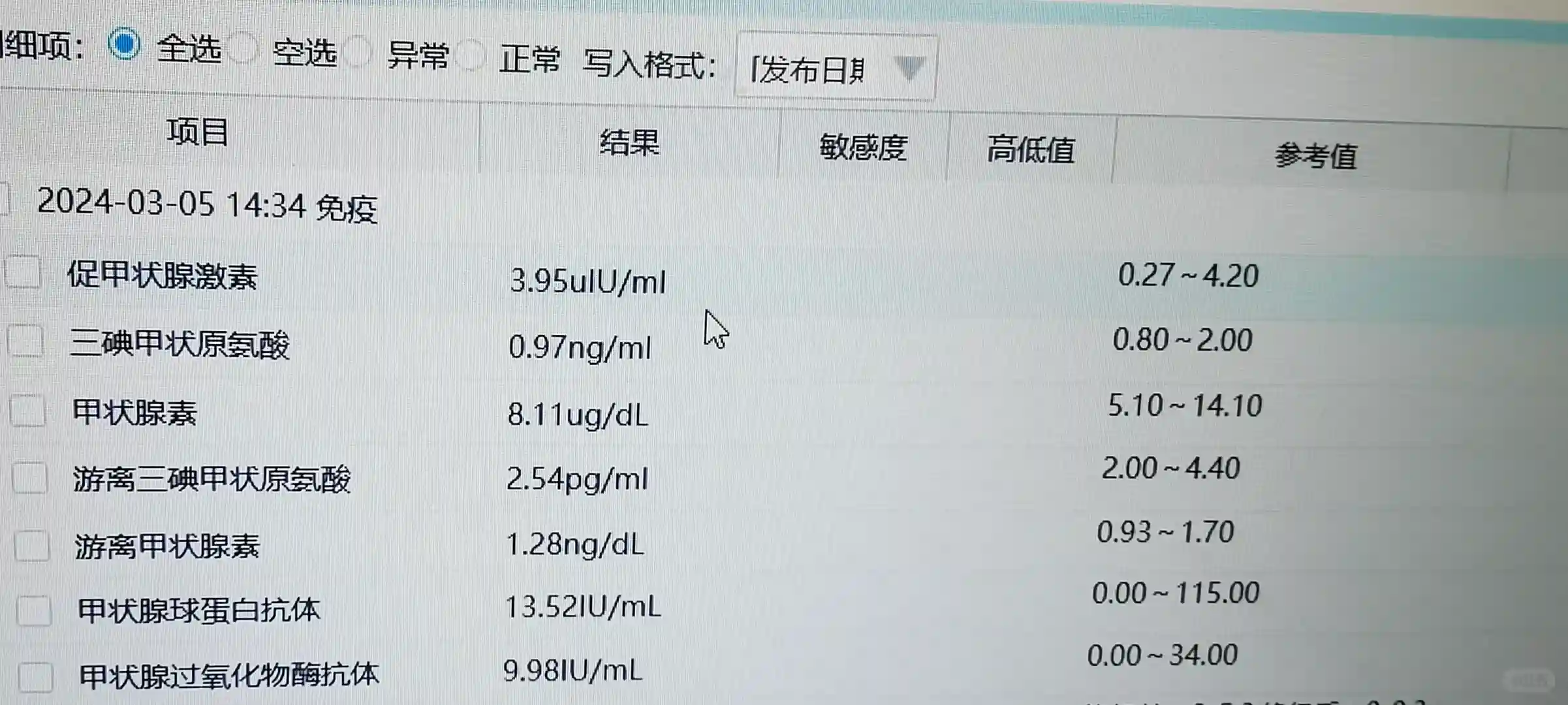 临出院测了一下甲状腺,没想到TSH又出了问题,还真是艰难的孕程。好在各类抗体数值都很ok,医生建议优甲乐在原基础上再加半片,半个月后复查,一定要在前三个月控制住。