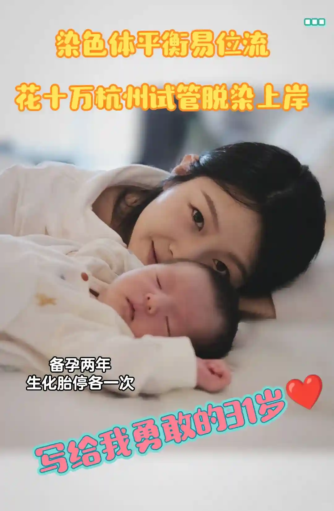 备孕一年半才怀,22年十月生化,去我们当地公立医院检查我染色体平衡易位,但不符合不孕不育条件,白大褂要求我们回家自怀,一年内没怀上或是再一次流才符合做的条件,后面又因为nt值太高建议流了,我不敢拿身体开玩笑再去堵下一次了。染平真的很难,我们直接放弃公立指标了,选择去私立做了三代PGS筛查,成功脱染6颗,因为是在私立也满足了我们的一部分私心移植了一颗4AB的蓝宝贝,耗时三个半月,花了十万成功上岸了,记得刚开始做这个决定的时候既害怕又很有勇气,害怕努力白费,害怕没有好的结果,但是谢谢宝贝也谢谢一直陪伴我的家人,没让我承担太多痛苦,从不爱哭泣的我在听到你哭声的那一刻我也跟着哭了好久,未来的日子里,我们一起努力成长吧!#杭州试管