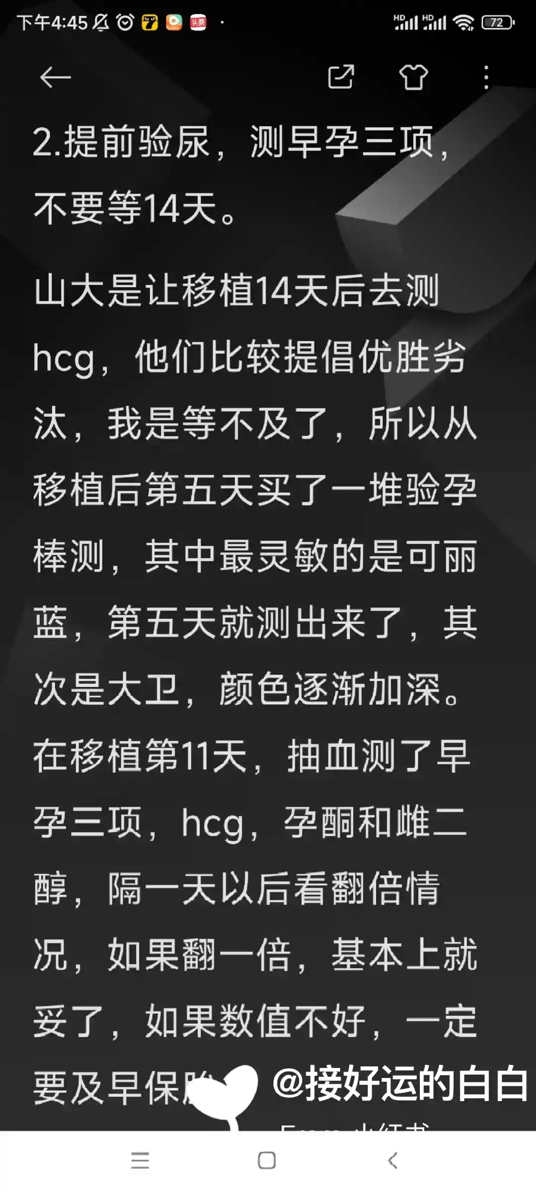 山大是让移植14天后去测hcg,他们比较提倡优胜劣汰,我是等不及了,所以从移植后第五天买了一堆验孕棒测,其中最灵敏的是可丽蓝,第五天就测出来了,其次是大卫,颜色逐渐加深。在移植第11天,抽血测了早孕三项,hcg,孕酮和雌二醇,隔一天以后看翻倍情况,如果翻一倍,基本上就妥了,如果数值不好,一定要及早保胎。