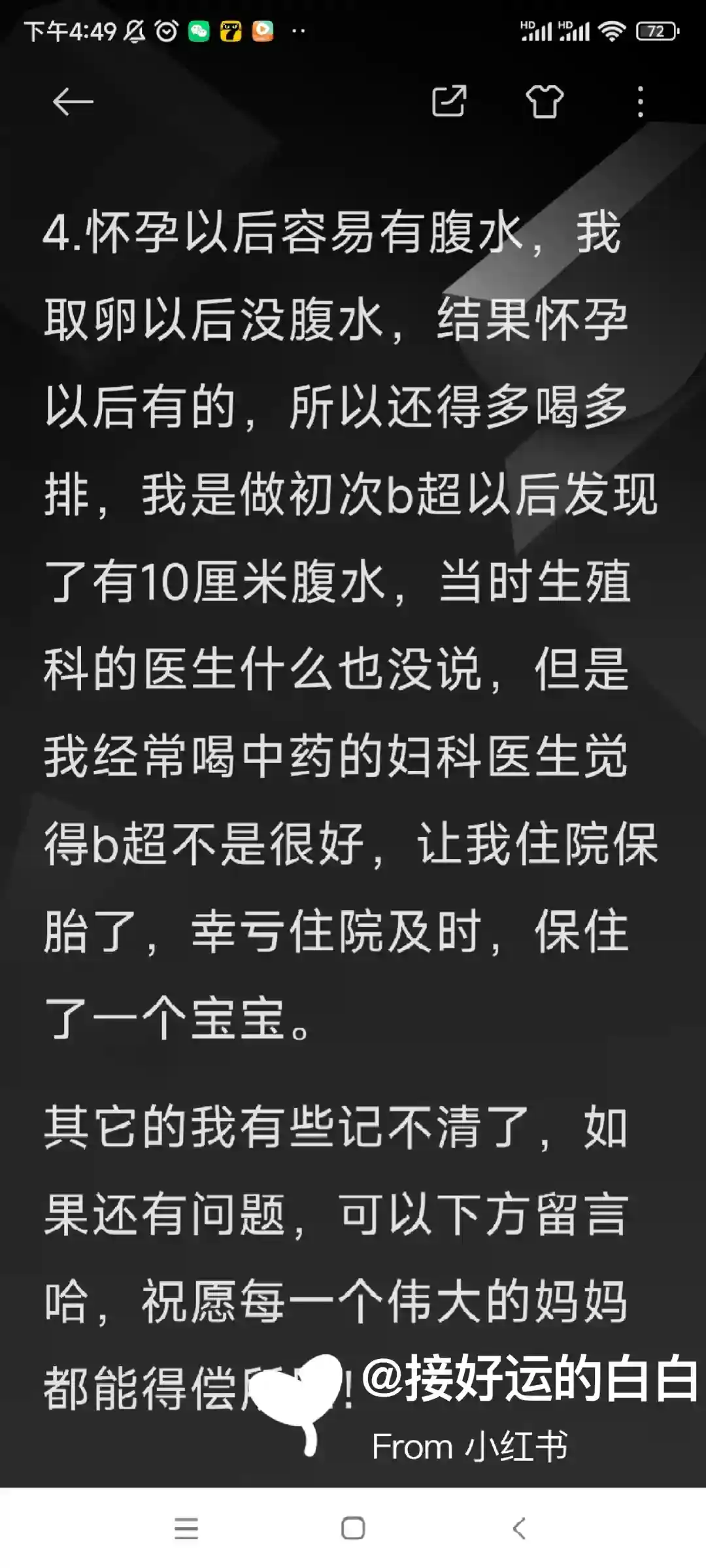 4..怀孕以后容易有腹水,我取卵以后没腹水,结果怀孕以后有的,所以还得多喝多排,我是做初次b超以后发现了有10厘米腹水,当时生殖科的医生什么也没说,但是我经常喝中药的妇科医生觉得b超不是很好,让我住院保胎了,幸亏住院及时,保住了一个宝宝。