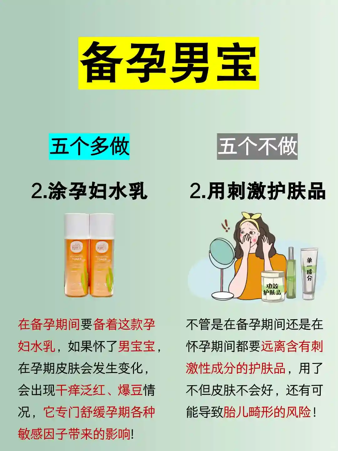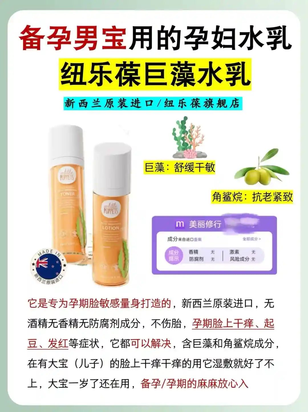 2.涂孕妇水乳:如果怀了男宝宝,在孕期皮肤会发生变化,会出现干痒泛红、爆豆情况,它专门舒缓孕期各种敏感因子!新西兰原装进口,无酒精无香精无防腐剂成分,不伤胎,孕期脸上干痒、起豆、发红等症状,都可以解决,含巨藻和角鲨烷成分,在有大宝(儿子)的脸上干痒干痒的用它湿敷就好了不上,大宝一岁了还在用,备孕/孕期的麻麻放心入