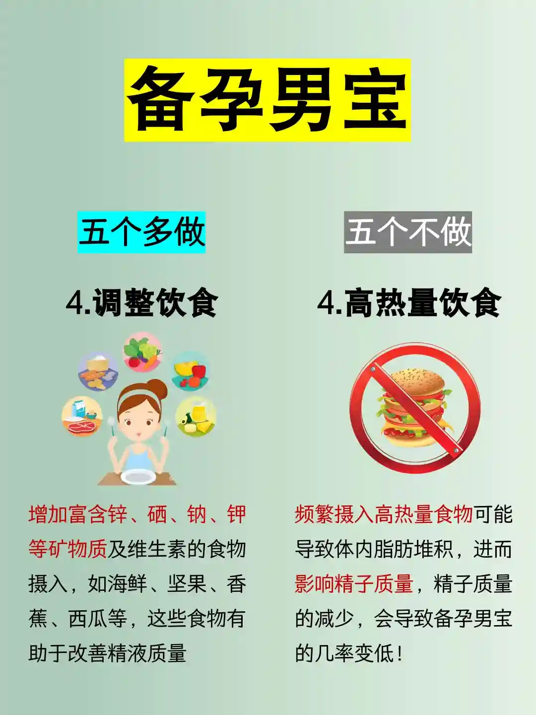 3.禁欲2-7天:确定备孕男宝双方都要禁欲2-7天,因为精子的浓稠怀男宝宝的几率会更大,相反精子稀少怀女宝宝的几率更大!