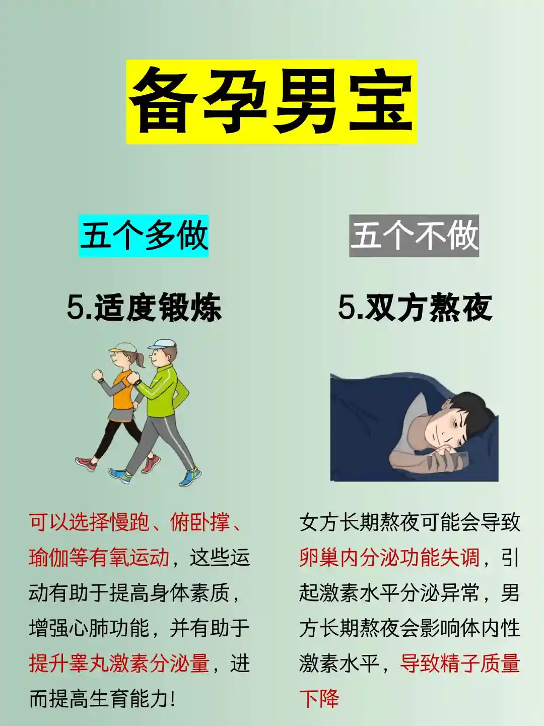 5.适度锻炼:可以选择慢跑、俯卧撑、瑜伽等有氧运动,这些运动有助于提高身体素质,增强心肺功能,并有助于提升睾丸激素分泌量,进而提高生育能力!