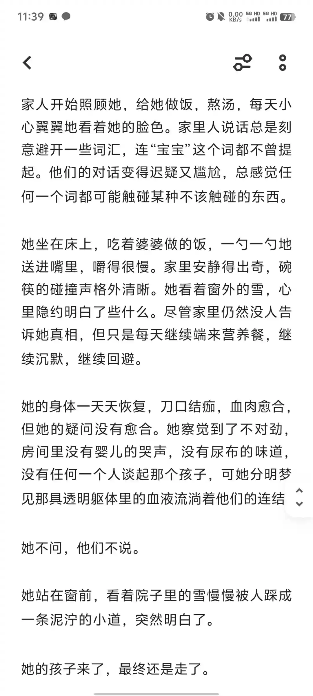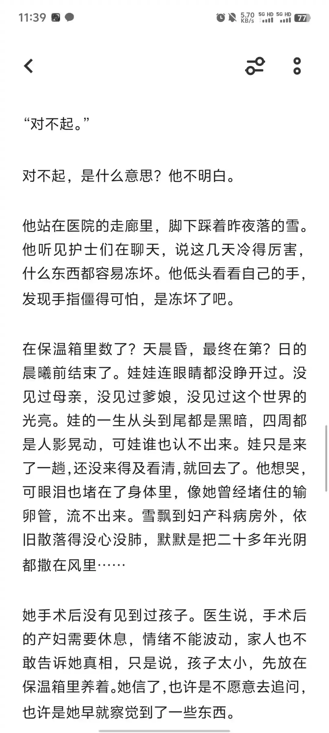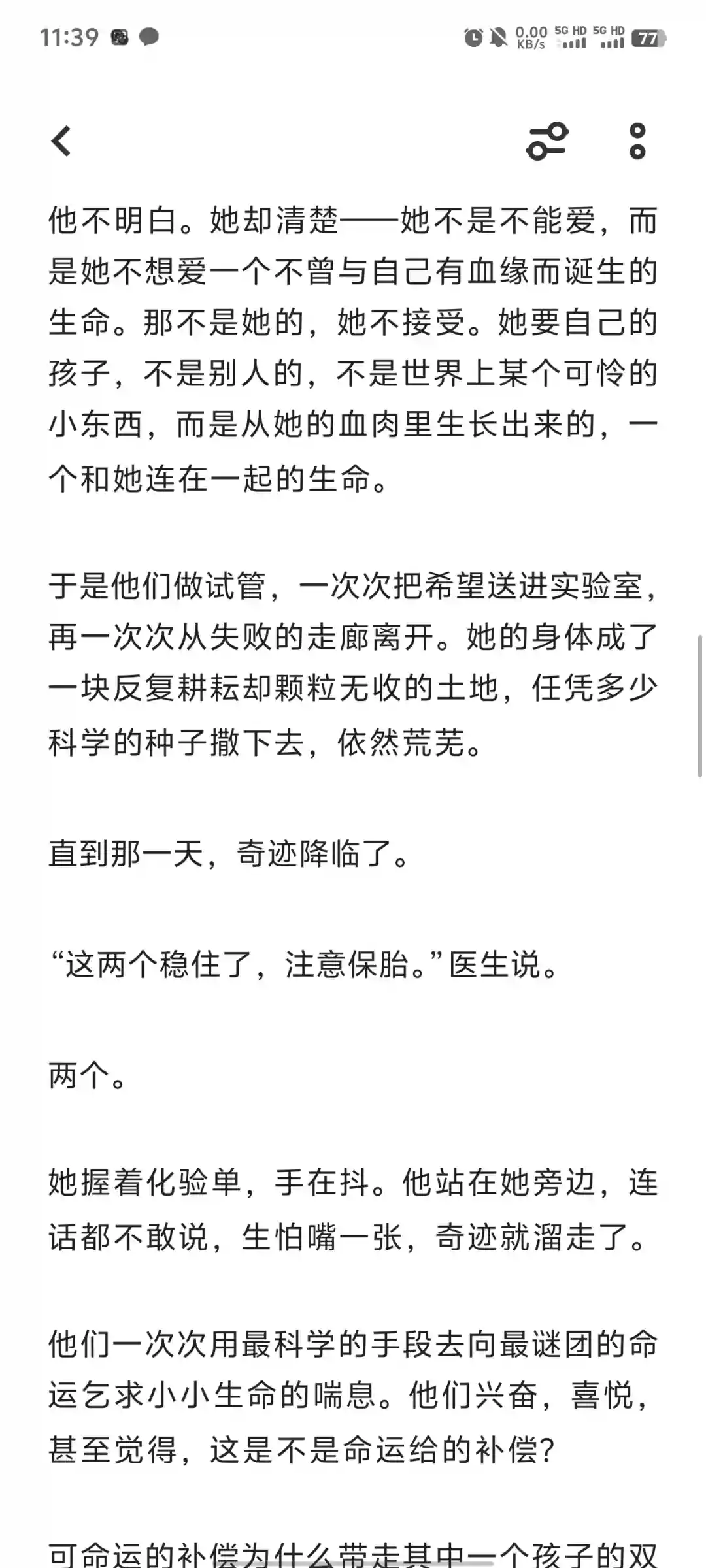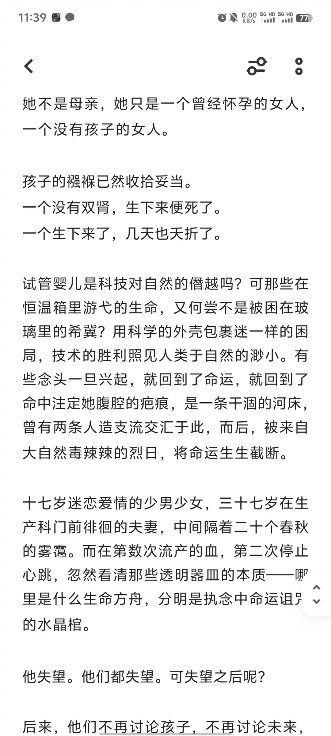 试管婴儿是科技对自然的僭越吗?可那些在恒温箱里游弋的生命,又何尝不是被困在玻璃里的希冀?用科学的外壳包裹迷一样的困局,技术的胜利照见人类于自然的渺小。有些念头一旦兴起,就回到了命运,就回到了命中注定她腹腔的疤痕,是一条干涸的河床,曾有两条人造支流交汇于此,而后,被来自大自然毒辣辣的烈日,将命运生生截断。