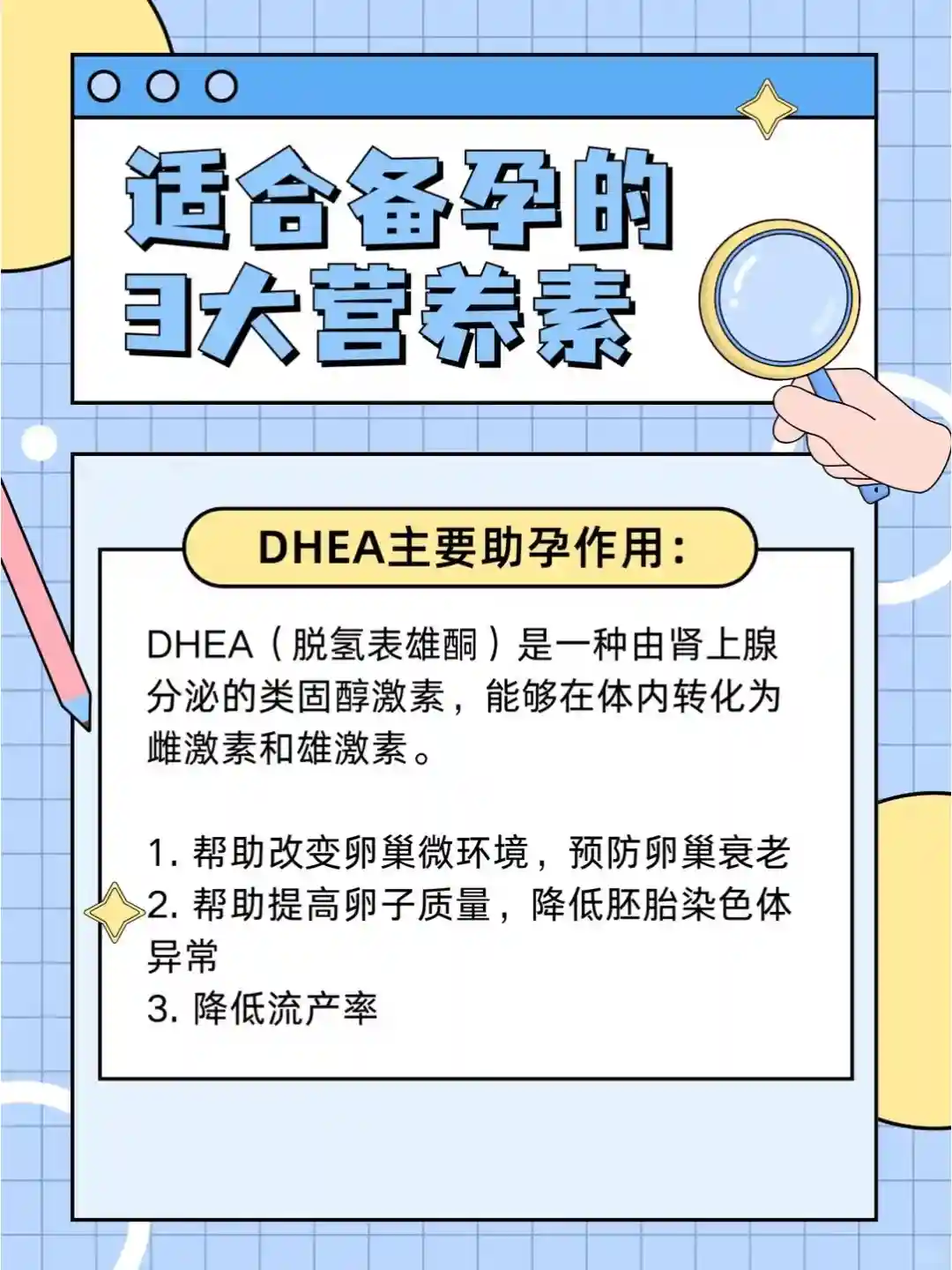 DHEA(脱氢表雄酮)是一种由肾上腺分泌的类固醇激素,能够在体内转化为雌激素和雄激素,对调节女性生理激素有一定影响。