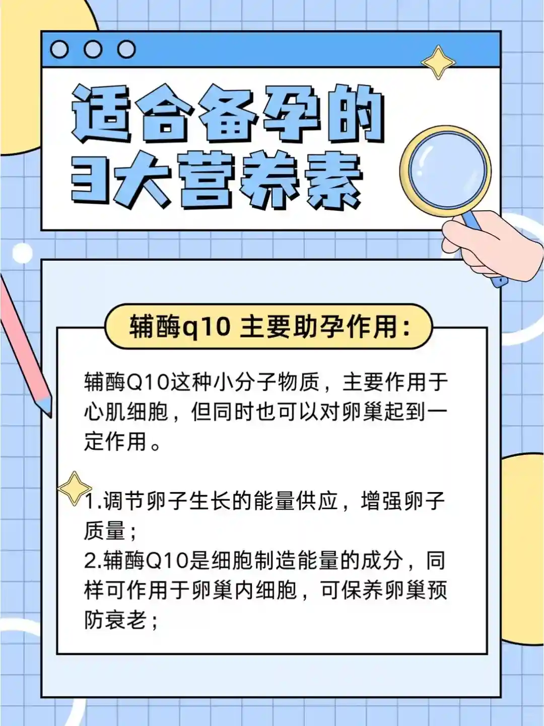 辅酶Q10是一种强亲脂性的抗氧化剂,存在于心脏、肾脏、肌肉等重要脏器和皮肤细胞中。作为一种小分子物质,辅酶Q10也被运用于预防卵子质量下降。