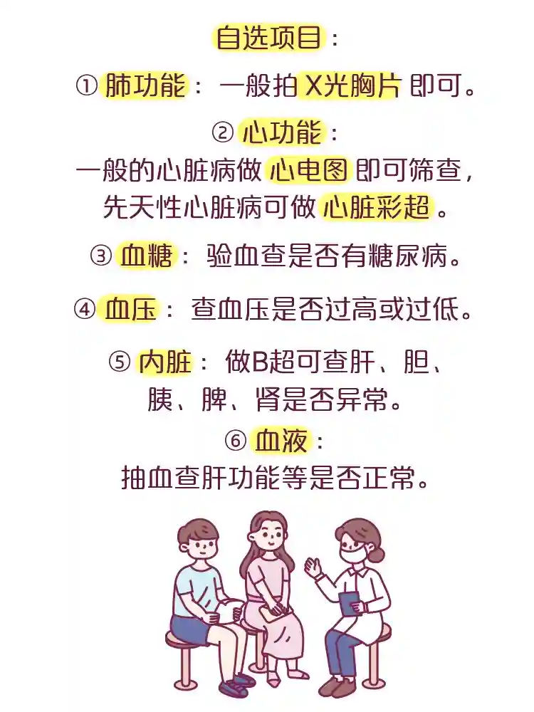 ②心功能:一般的心脏病做心电图即可筛查,先天性心脏病可做心脏彩超
