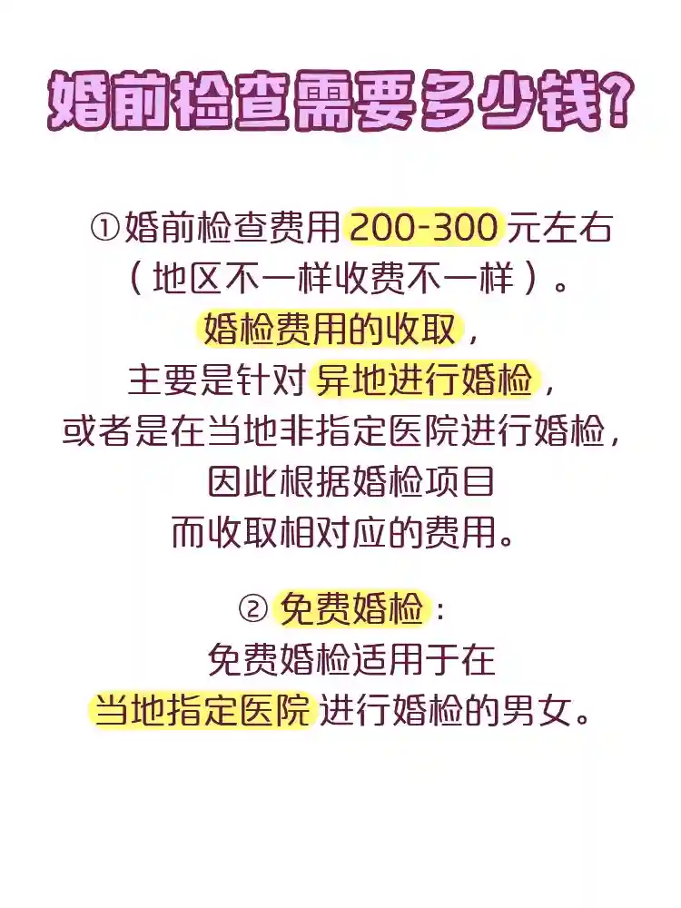 ①婚前检查费用200-300元左右(地区不一样收费不一样)。