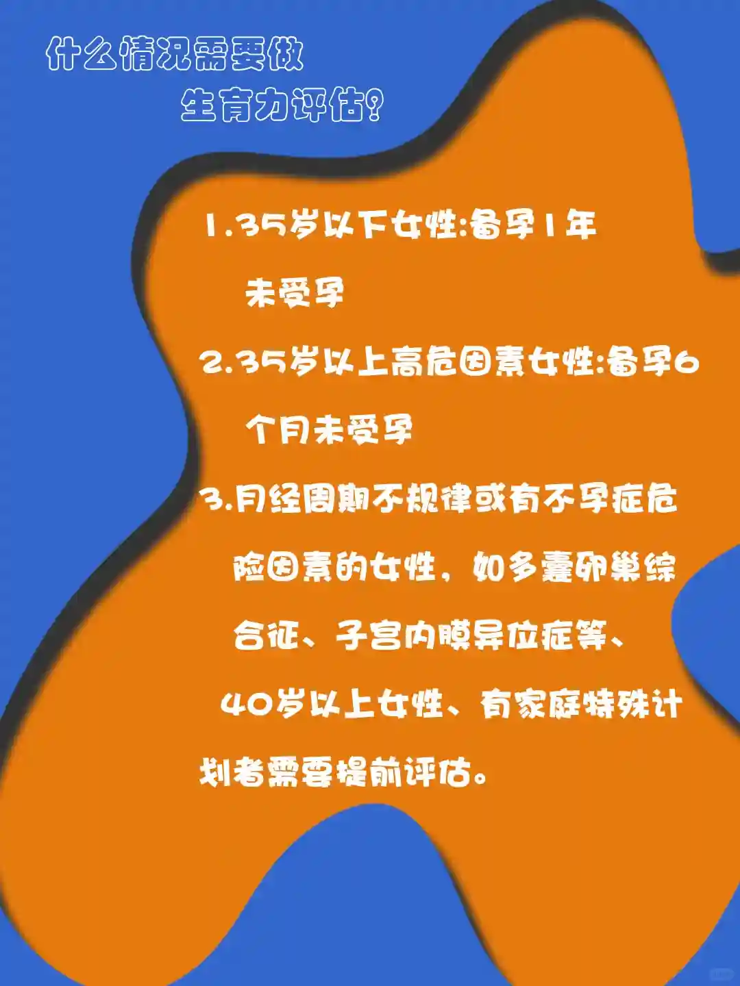 3.月经周期不规律或有不孕症危险因素的女性,如多囊卵巢综合征、子宫内膜异位症等、40岁以上女性、有家庭特殊计划者需要提前评估。
