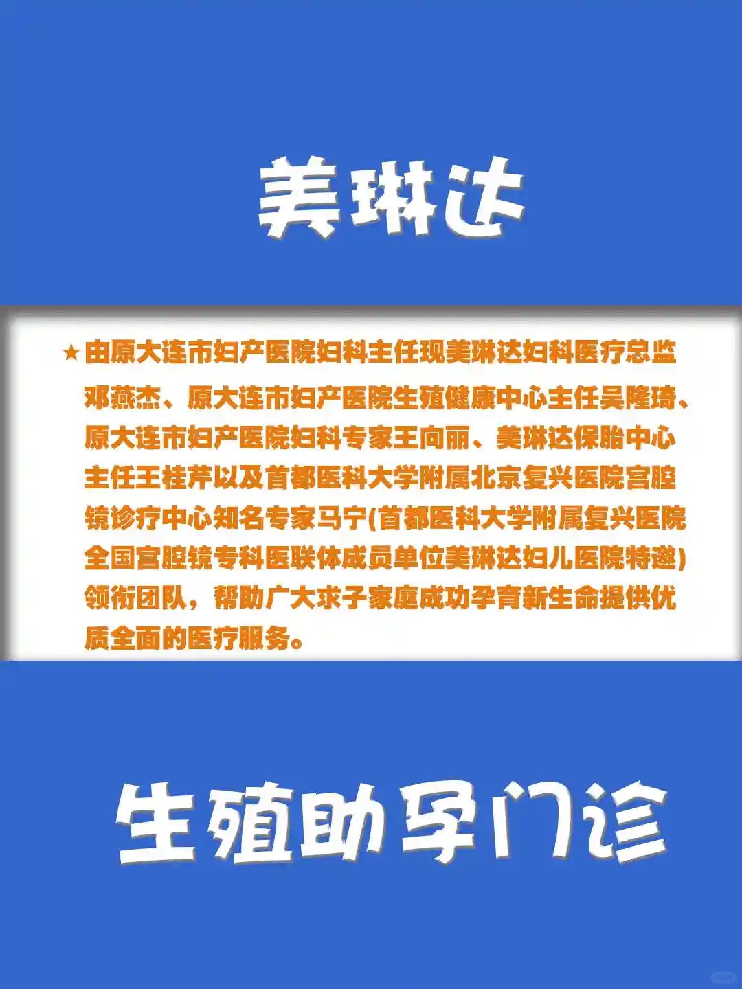 美琳达生殖助孕门诊|由原大连市妇产医院妇科主任现美琳达妇科医疗总监邓燕杰、原大连市妇产医院生殖健康中心主任吴隆琦、原大连市妇产医院妇科专家王向丽、美琳达保胎中心主任王桂芹以及首都医科大学附属北京复兴医院宫腔镜诊疗中心知名专家马宁(首都医科大学附属复兴医院全国宫腔镜专科医联体成员单位美琳达妇儿医院特邀)领衔团队,帮助广大求子家庭成功孕育新生命提供优质全面的医疗服务。#女性健康
