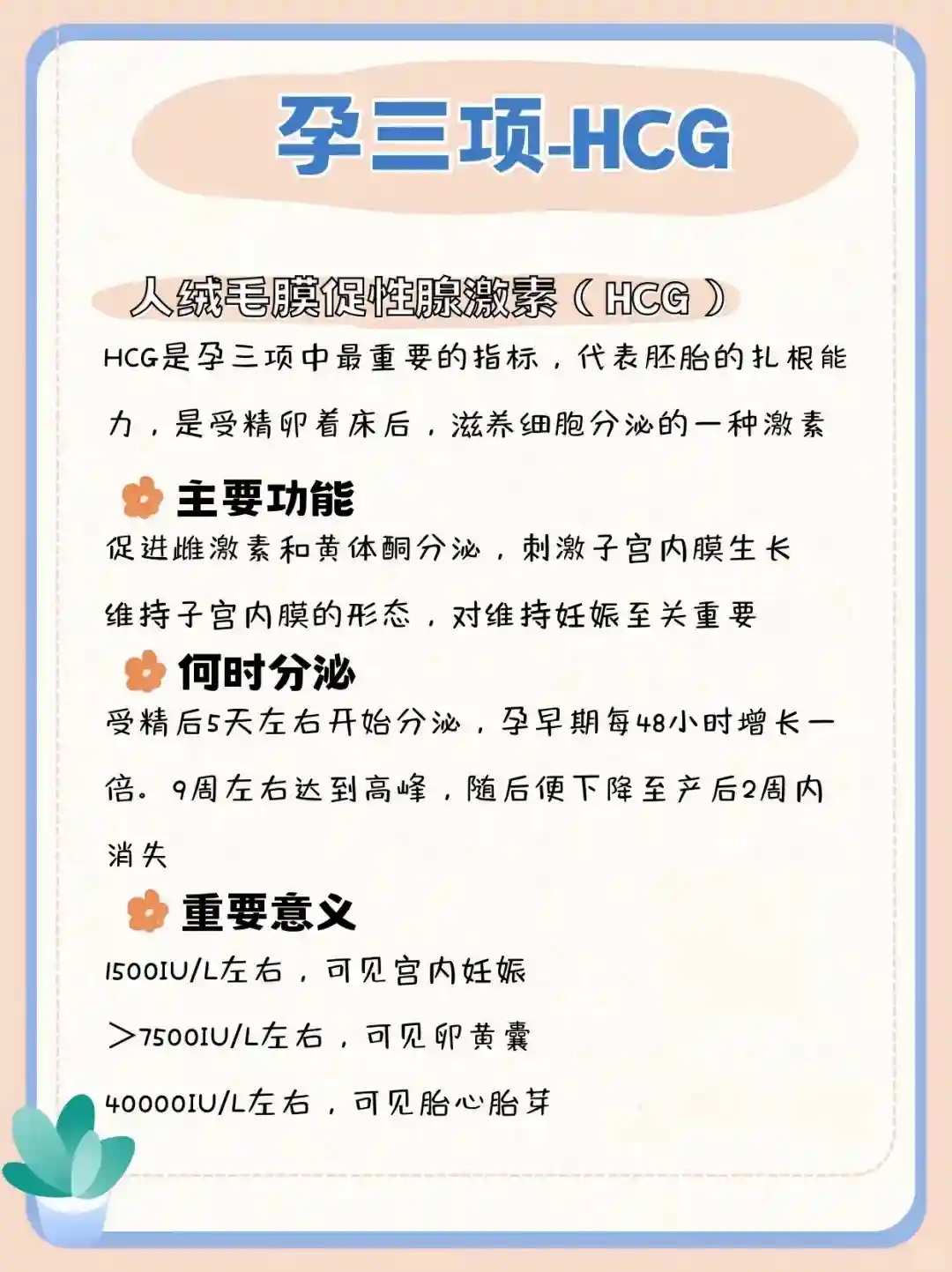 HCG是孕三项中最重要的指标,代表胚胎的扎根能力,是受精卵着床后,滋养细胞分泌的一种激素