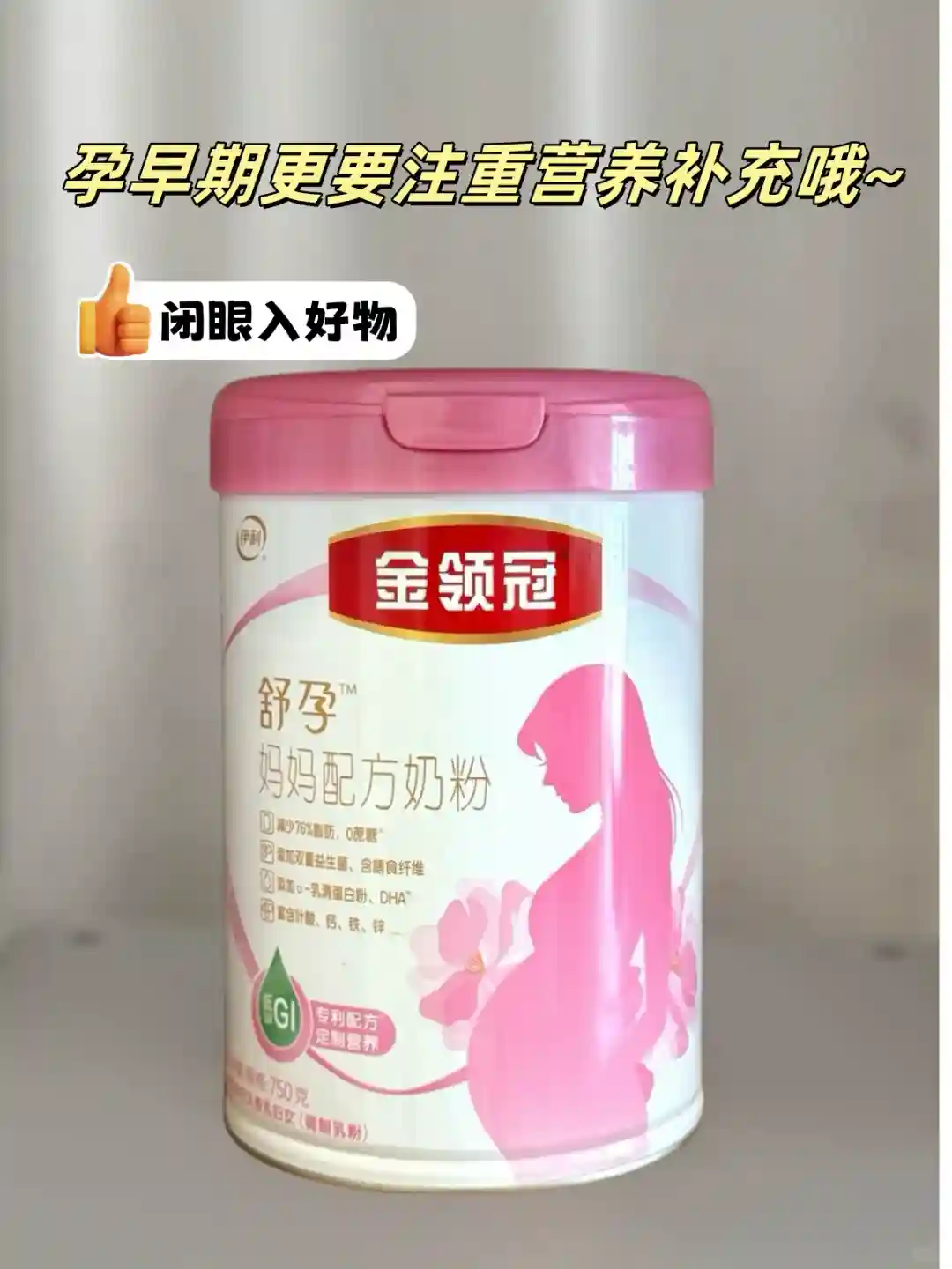 除了按时产检,另外孕期也不要忘记各类营养素的均衡摄入,我是比较不喜欢那些瓶瓶罐罐的,比较多又容易忘,所以刚确认怀孕那时候就准备买孕妇奶粉来喝,做了好多功课,最后选择了金领冠妈妈粉,低GI少脂0蔗糖,营养还非常多样,我和宝宝的需求都能照顾得到的同时还不用担心会长胖。