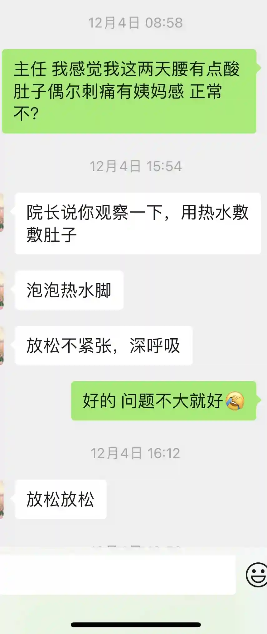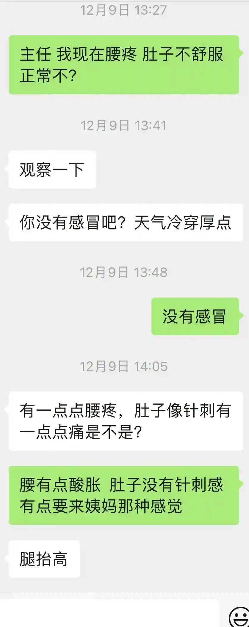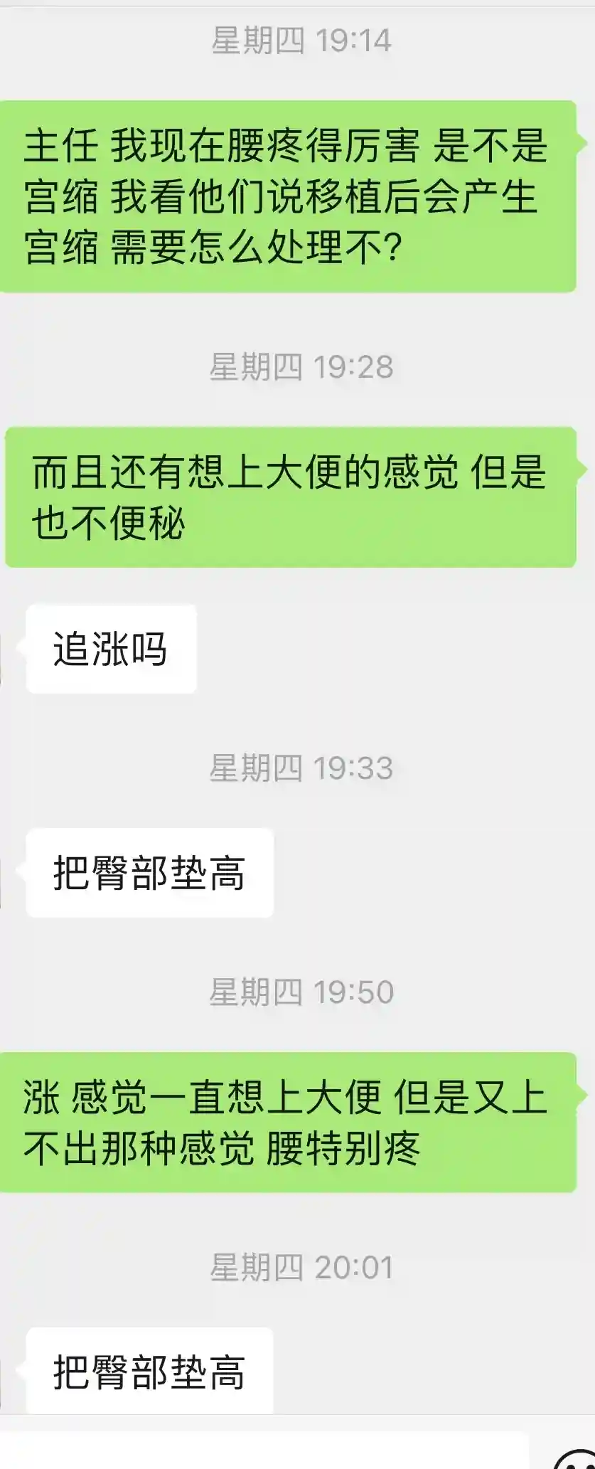 3⃣️移植的第五天也就是12号,我又再次给我医生说我腰疼得厉害,还有肛门坠胀感,是不是宫缩?我的医生给我的回答 把臀部垫高(图三)
