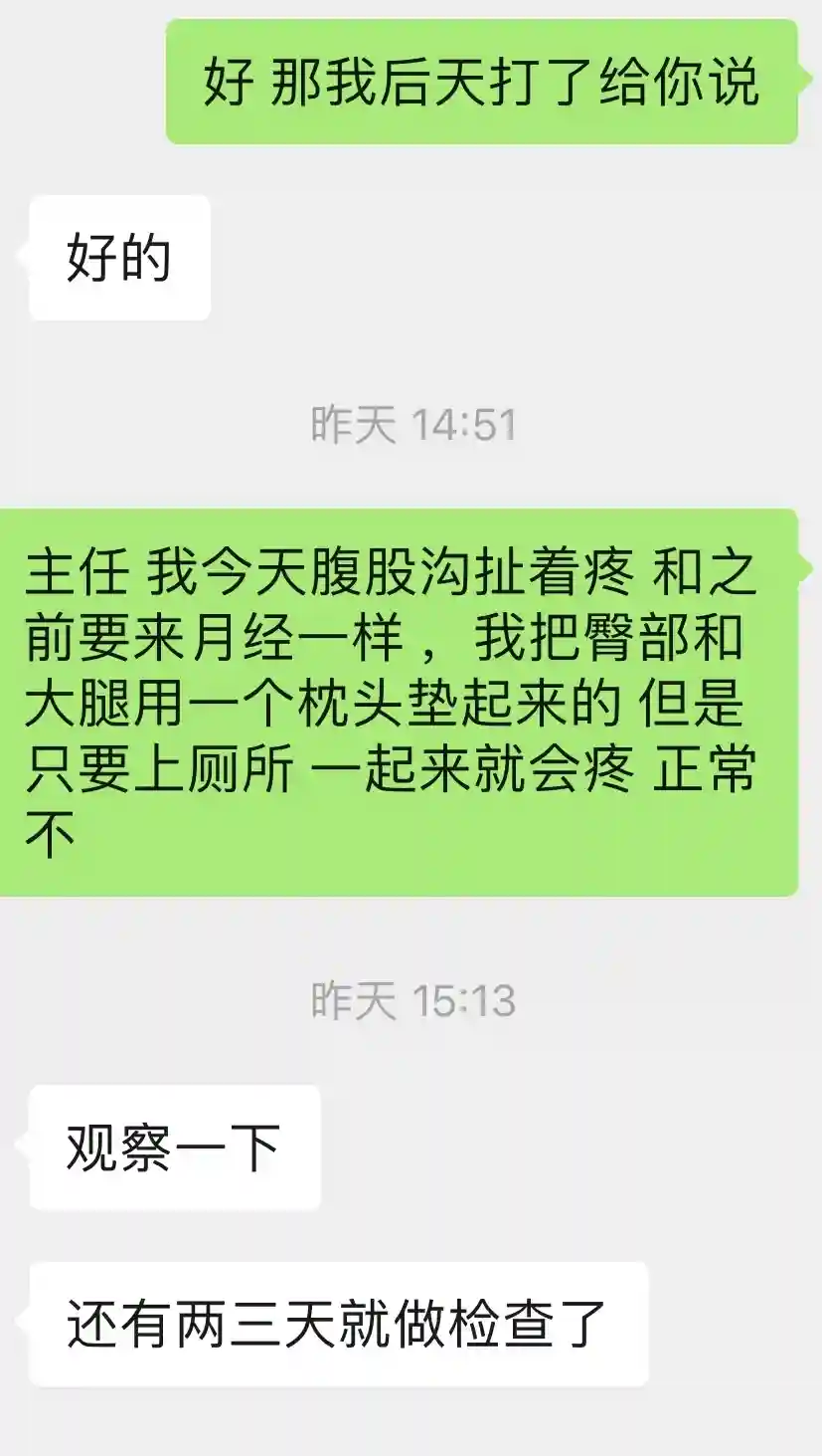 4⃣️移植第八天也就是15号,我再次给我医生说,我今天腹股沟扯着疼 她的回答:观察一下(图五)