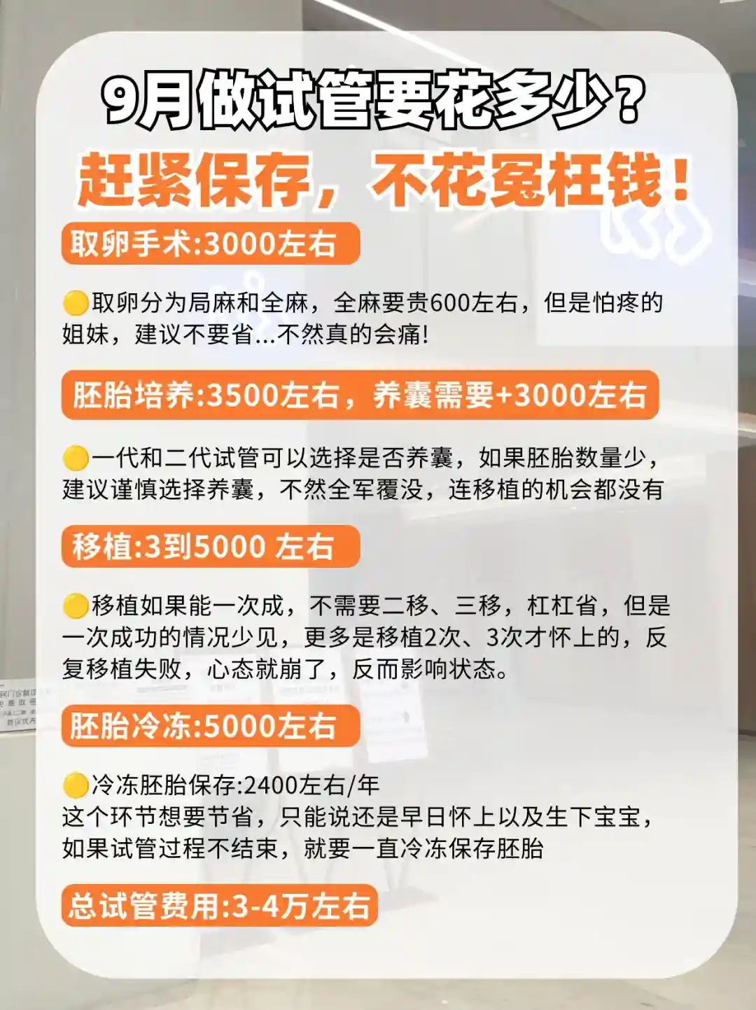 这个环节想要节省,只能说还是早日怀上以及生下宝宝,如果试管过程不结束,就要一直冷冻保存胚胎