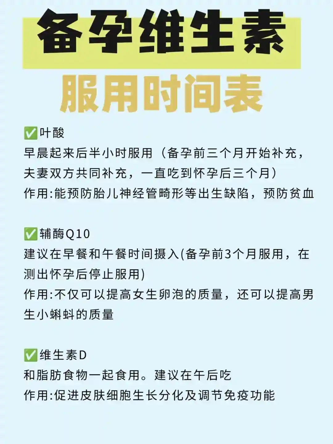1、叶酸:早晨后半小时服用。(备孕前3个月开始补充,夫妻双方共同补充,一直吃到怀孕后三个月)