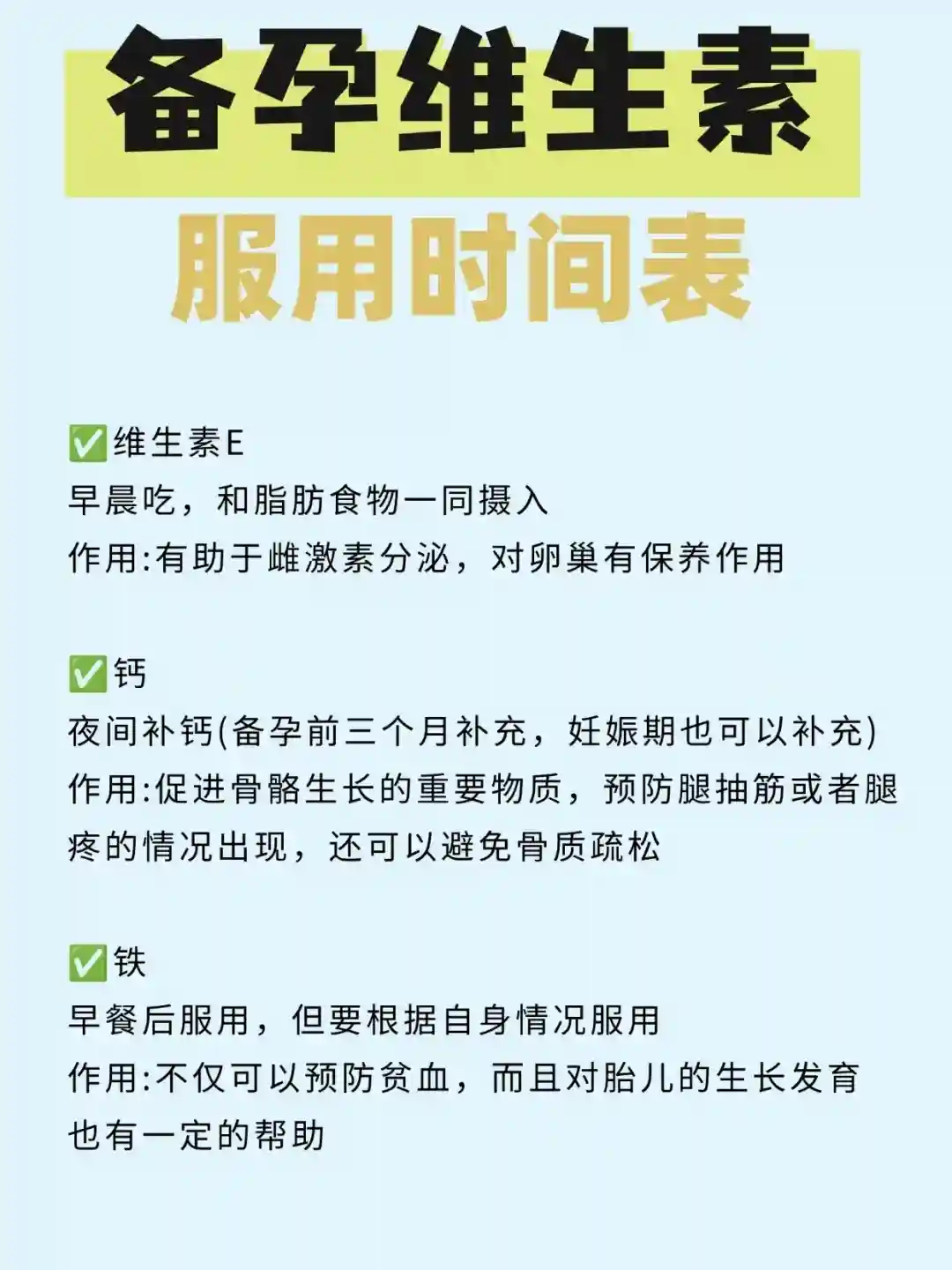 6、铁:早餐后服用(但要根据自身情况服用)最后,温馨提示:备孕期间要跟自身情况补充对应的营养剂,切不可盲目服用哦,最好在医生的建议下服用#备孕吃什么#科学备孕#大大方方做自己
