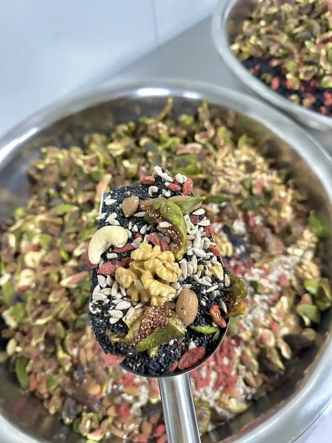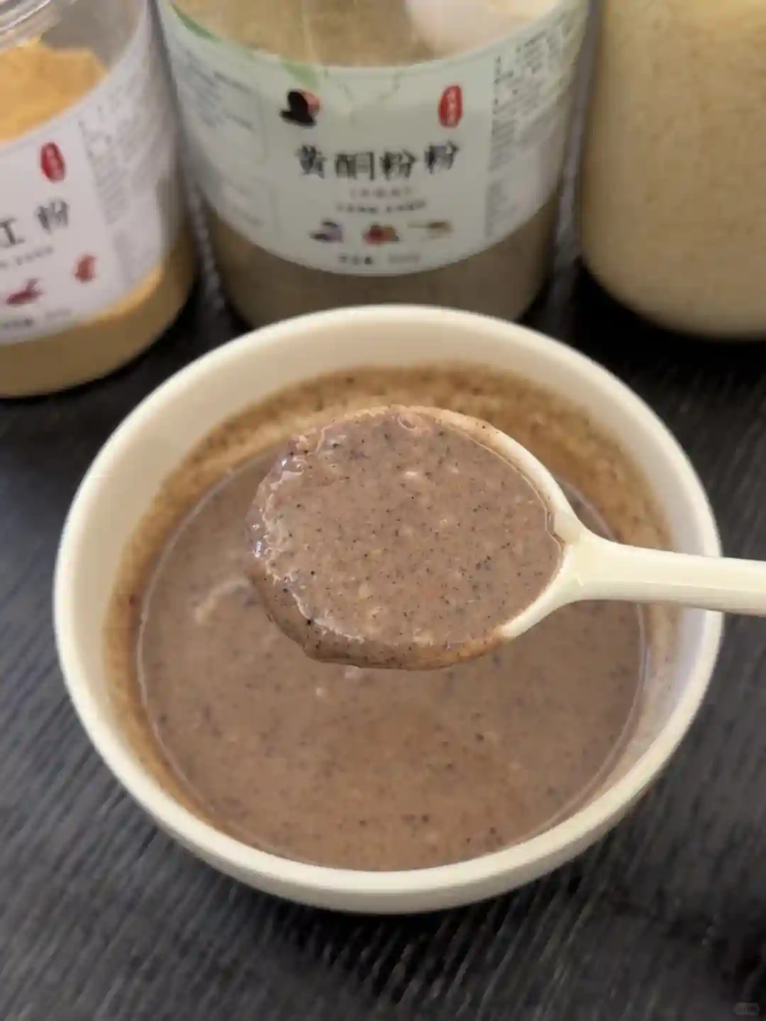 粉粉材料:生南瓜籽、亚麻籽、黑豆、黑芝麻、葛根、青皮无花果、桑葚干、红枸杞