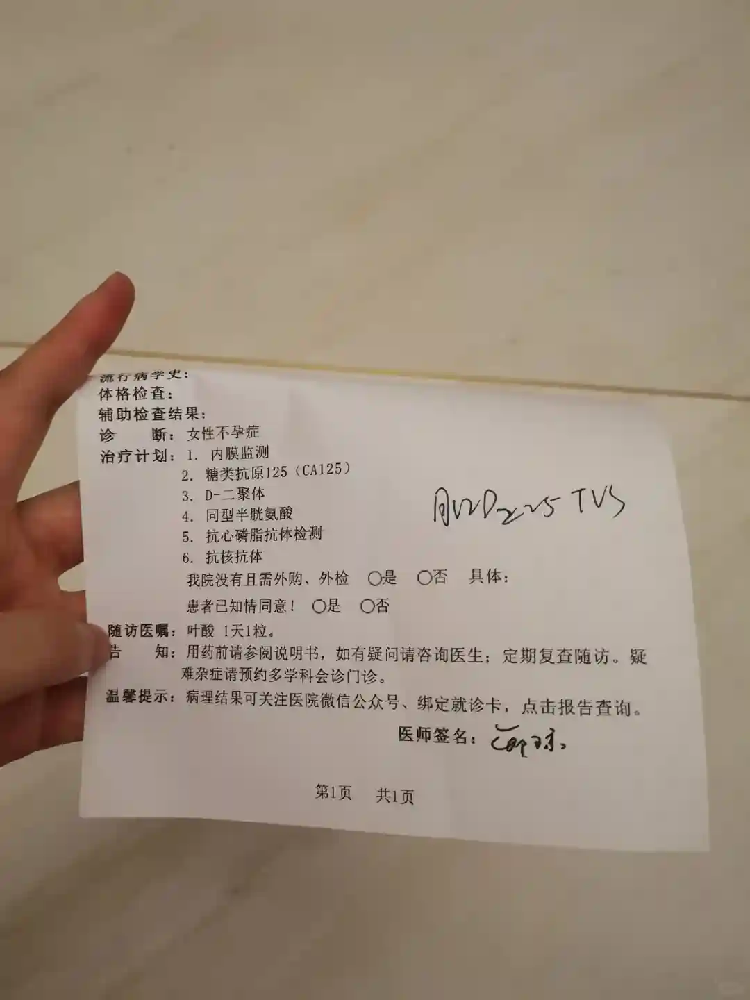 挂到了邢主任的号,这是我di一次看邢主任。拿给邢主任看,她说这是没着床。之前移植开的药停了,停药一周内会来月经,来月经的第2-3天返院做b超,还开了图二这些免疫和其他方面的检查。之后就是准备二移了。