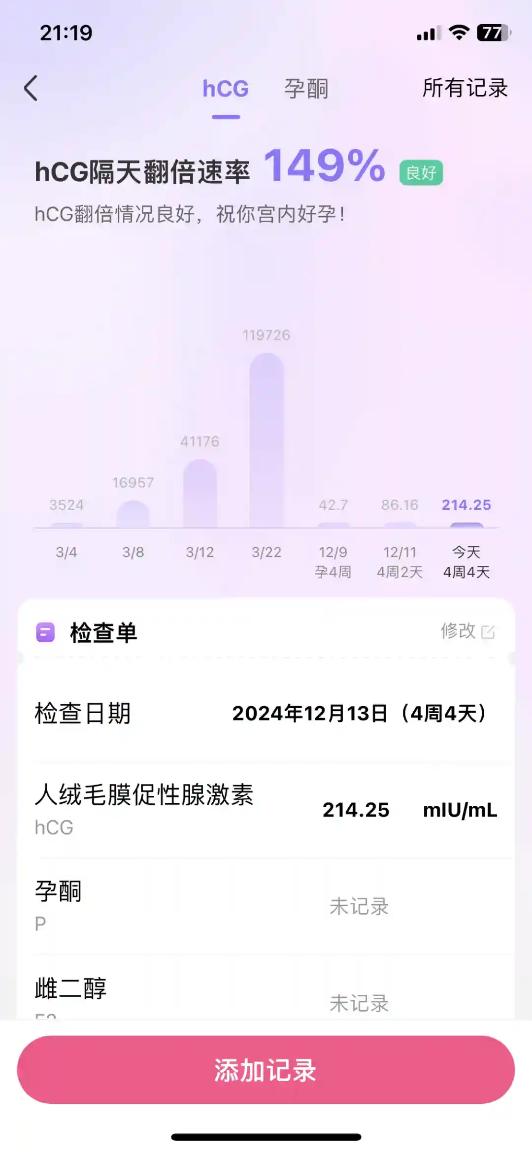 本来不抱任何希望,没想到PL11天测到意念灰。随着试纸加深,PL14天到医院抽血,hcg数值却很低,我知道这不是好消息。