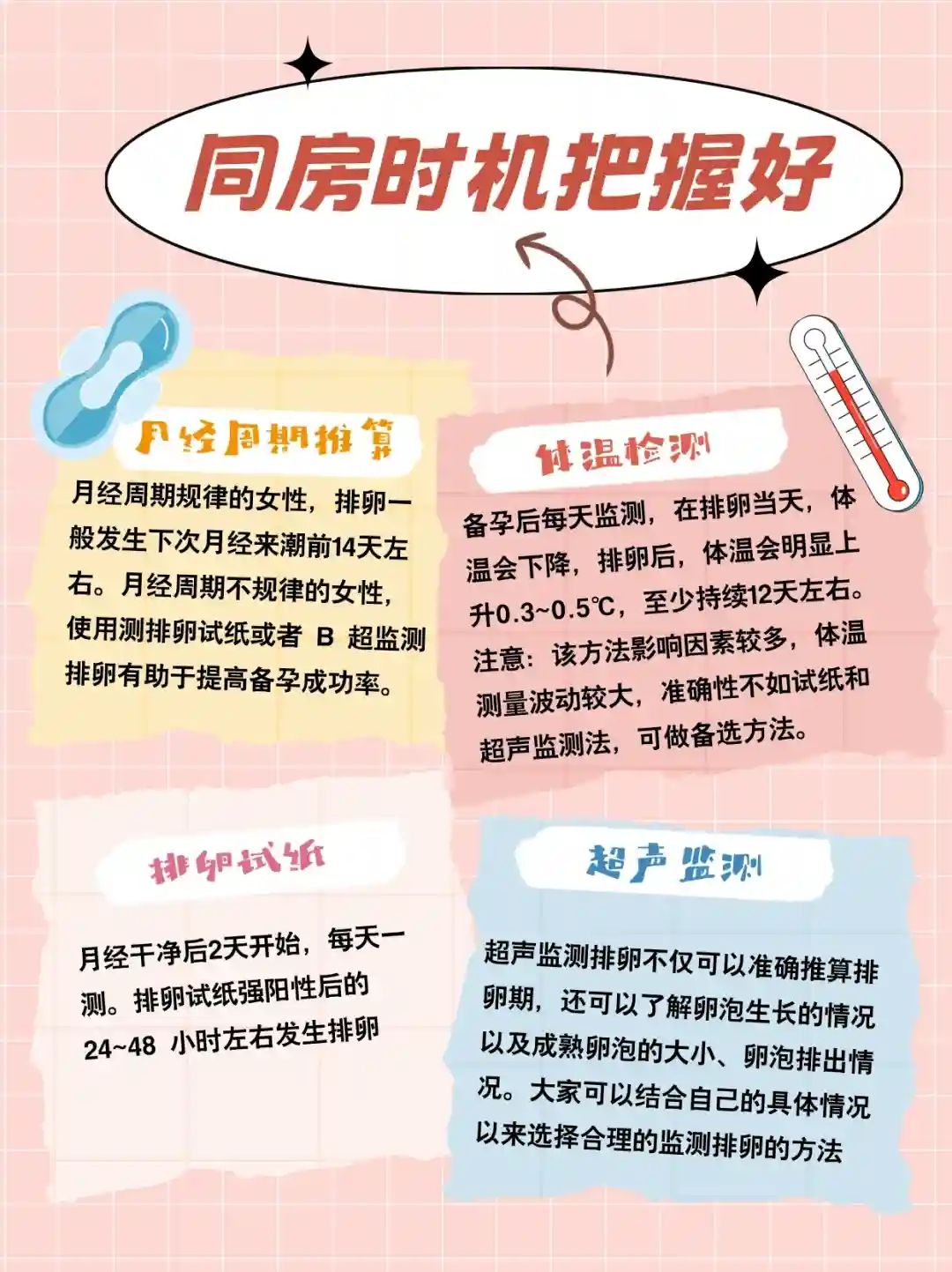 精准算好排卵期是成功造人的关键。排卵前1~2 天、排卵日以及排卵后1天同房怀孕几率较高。
