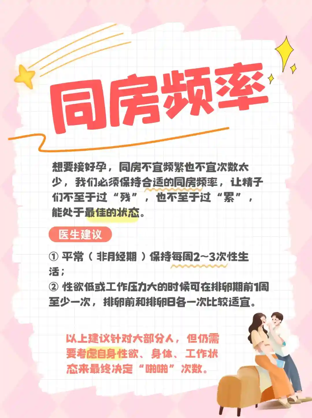 ⭐️第三步:同房频率想要接好孕,同房不宜频繁也不宜次数太少,我们必须保持合适的同房频率,让精子们不至于过“残”也不至于过“累”,能处于最佳的状态。