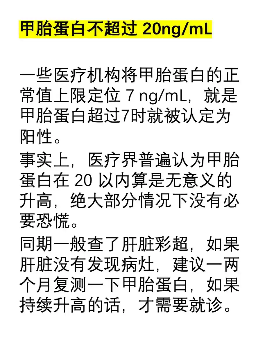 • 甲胎蛋白不超过 20 ng/mL。 一些医疗机构将甲胎蛋白的正常值上限定位 7 ng/mL,就是甲胎蛋白超过7时就被认定为阳性。事实上,医疗界普遍认为甲胎蛋白在 20 以内算是无意义的升高,绝大部分情况下没有必要恐慌。同期一般查了肝脏彩超,如果肝脏没有发现病灶,建议一两个月复测一下甲胎蛋白,如果持续升高的话,才需要就诊。