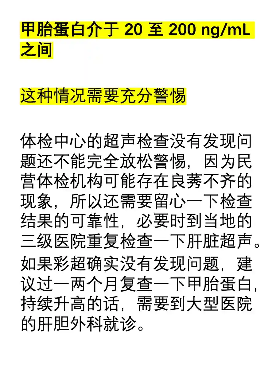 • 甲胎蛋白介于 20 至 200 ng/mL 之间。 需要充分警惕肿瘤的可能。体检中心的超声检查没有发现问题还不能完全放松警惕,因为民营体检机构可能存在良莠不齐的现象,所以还需要留心一下检查结果的可靠性,必要时到当地的三级医院重复检查一下肝脏超声。如果彩超确实没有发现问题,建议过一两个月复查一下甲胎蛋白,持续升高的话,需要到大型医院的肝胆外科就诊。